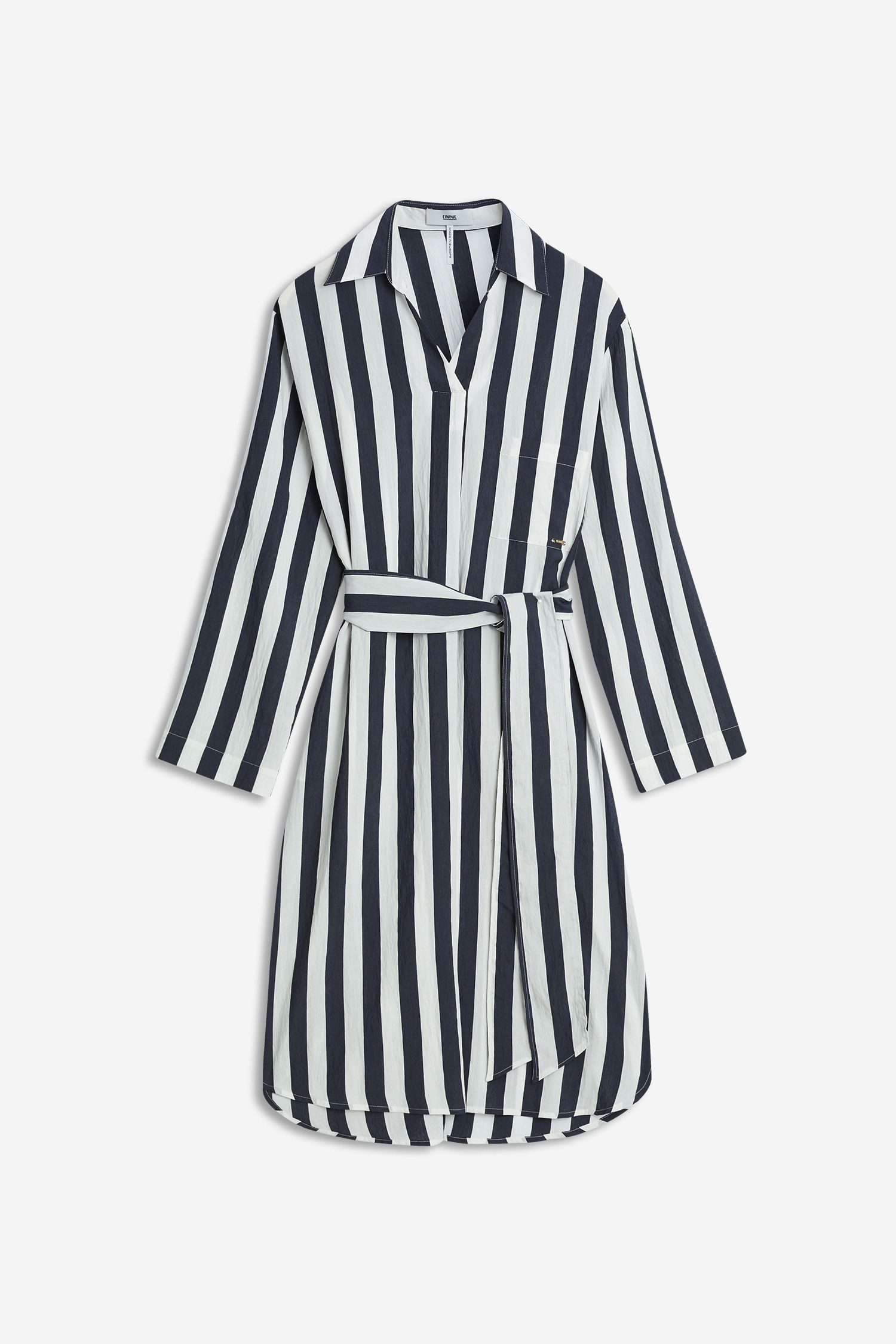 Das Kleid aus einer leichten, fließenden Qualität überrascht mit seinem weiß-blauen Streifen-Design. Perfekt für einen lässigen, entspannten Sommer – ob fernab oder zu Hause. Ein Bindegürtel und krempelbare Ärmel runden den Look stilvoll ab.