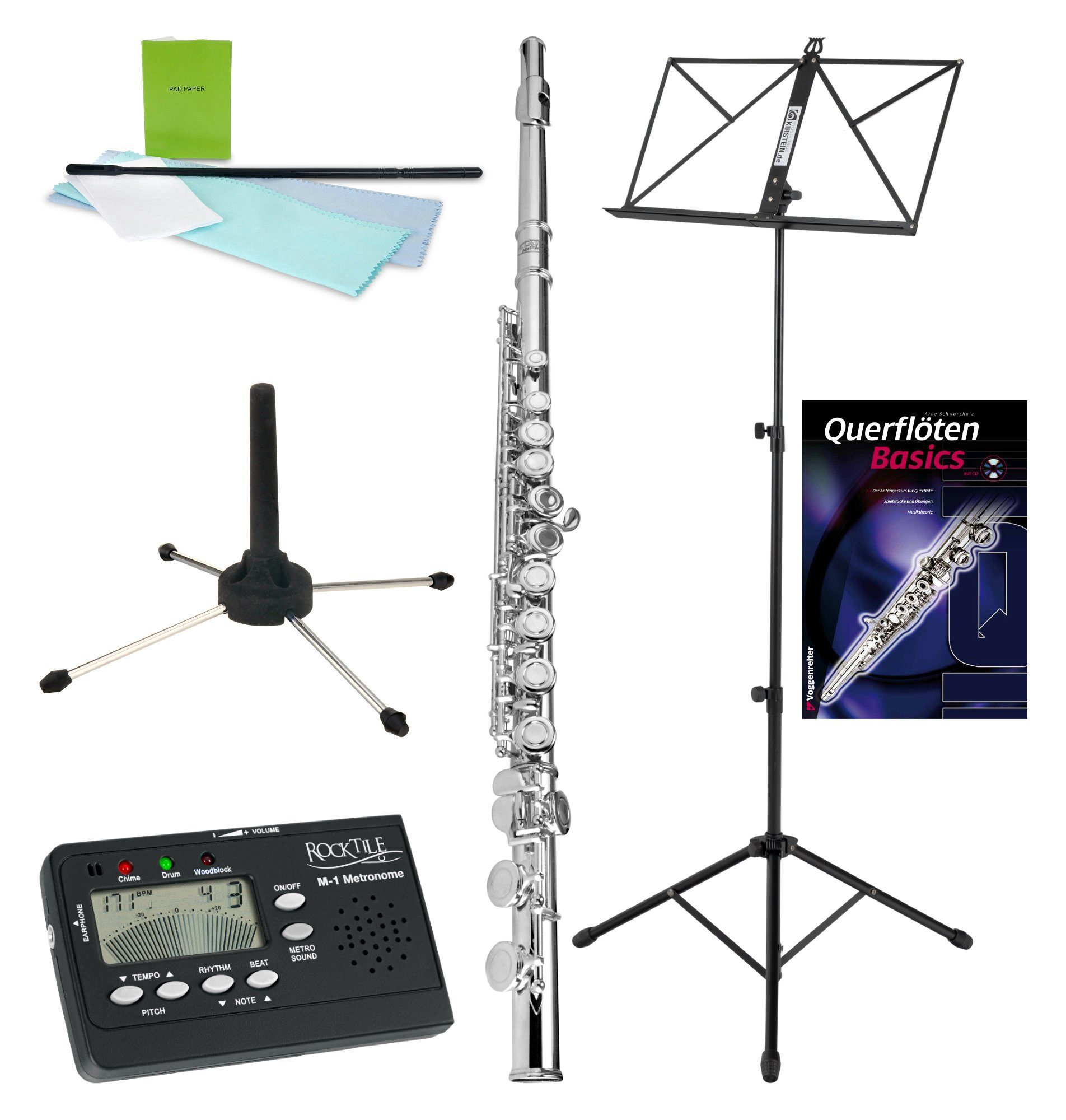 Lieferumfang | 1x Querflöte 1x Etui 1x Wischerstab 1x Metronom/Tuner 1x Notenständer mit Tasche 1x Querflötenständer Reinigungsset Anfängerkurs Querflöten Basics mit CD |