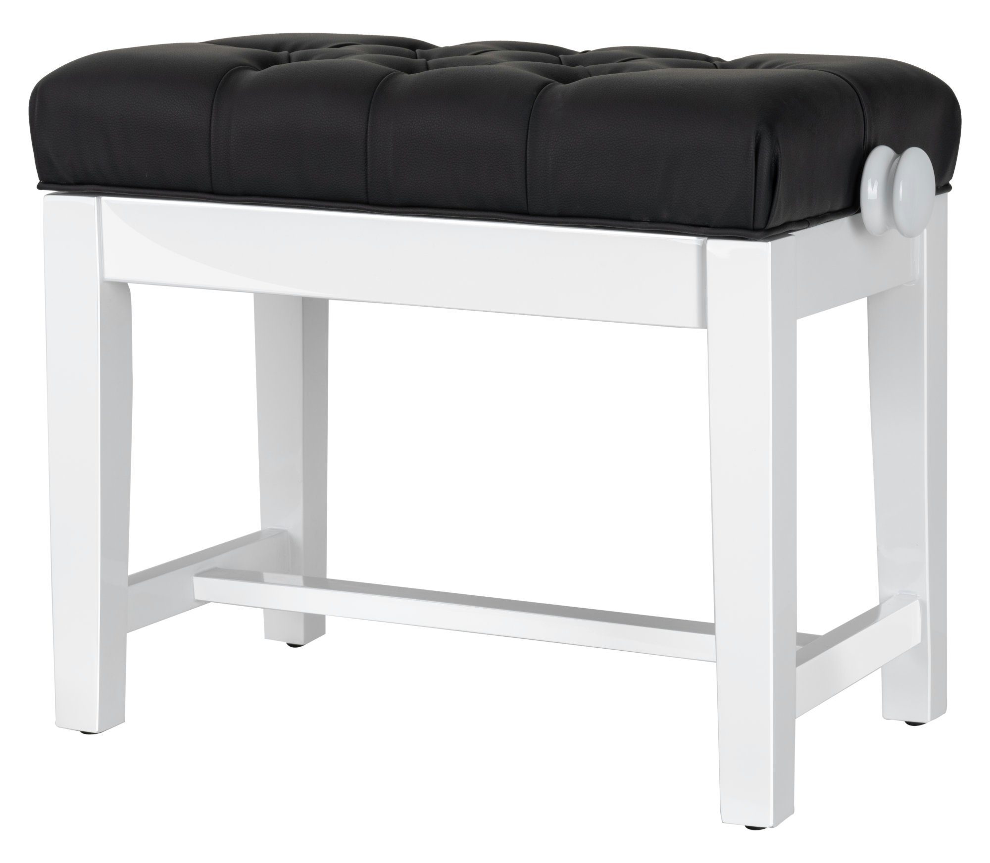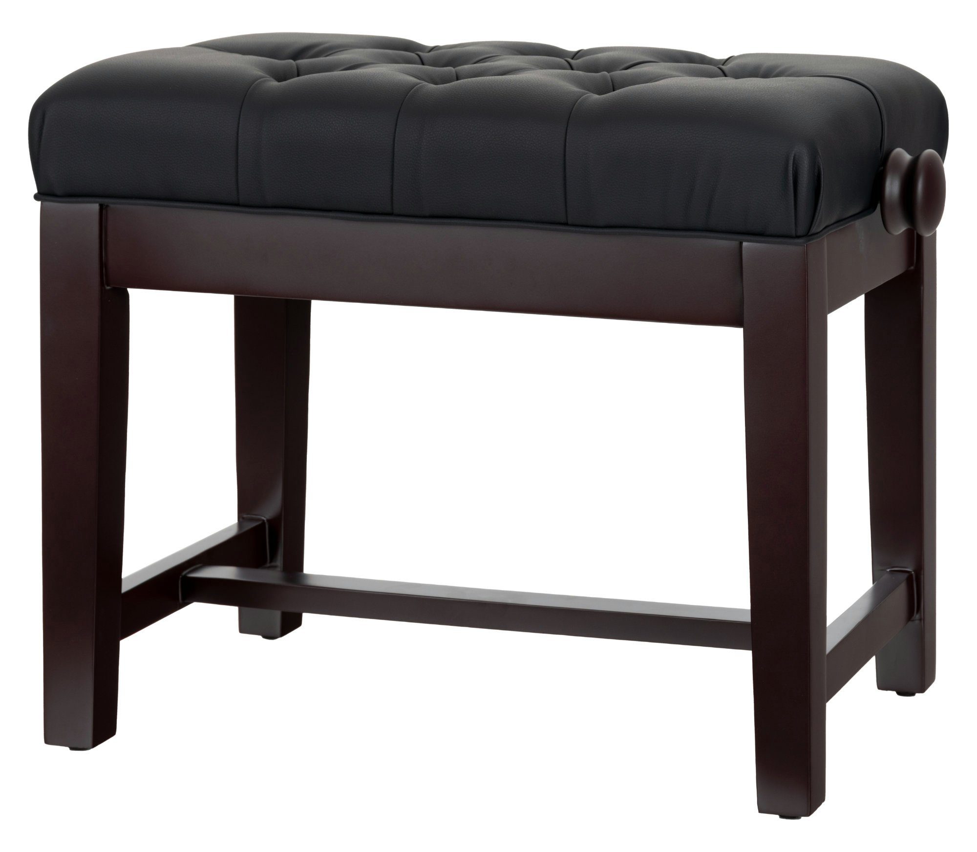 Der Rahmen dieser Bank ist fest mit den Beinen verleimt, wodurch eine sehr hohe Stabilität bis zu einer Belastung von 200 kg gewährleistet wird. Die Streben an der Unterseite schaffen hier zusätzliche Sicherheit. Ihre edle Optik erhält die Pianobank weiterhin durch eine aufwendig vernähte Sitzfläche, welche mit Kapitonierungen versehen ist. Als spezielles Feature sind die Gummifüße an der Unterseite mit einem Gewinde versehen, dadurch schützen sie nicht nur vor Kratzern im Fußboden, sondern können auch Bodenunebenheiten ausgleichen.