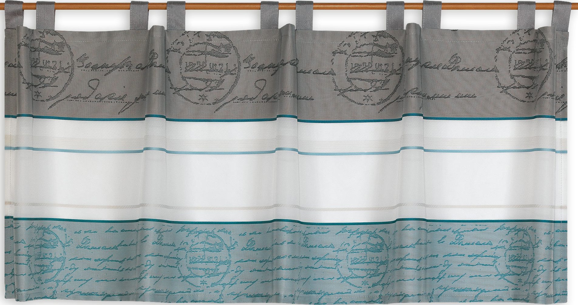 Moderne Scheibengardine mit 10 Schlaufen in der Höhe 50 cm x 140 cm Breite. Die Küchengardine besteht aus grauen und petrolfarbenen halbtransparenten Dekostoff. Die Oberfläche des Stoffes ist leicht glänend. Der Mittelteil besteht aus transparenten Voile. Die Farben der Scheibengardine sind gut aufeinander abgestimmt. Diese Scheibengardine im modernen Stil ist hochwertig verarbeitet und sofort leicht anzubringen. Einfach auf eine dünne Stange bis 12mm Durchmesser oder Vitragenstange schieben und auf die Dekorationsbreite verteilen. Die Scheibengardine ist eine schöne Kombination aus Sichtschutz und geschmackvoller Fensterdekoration.