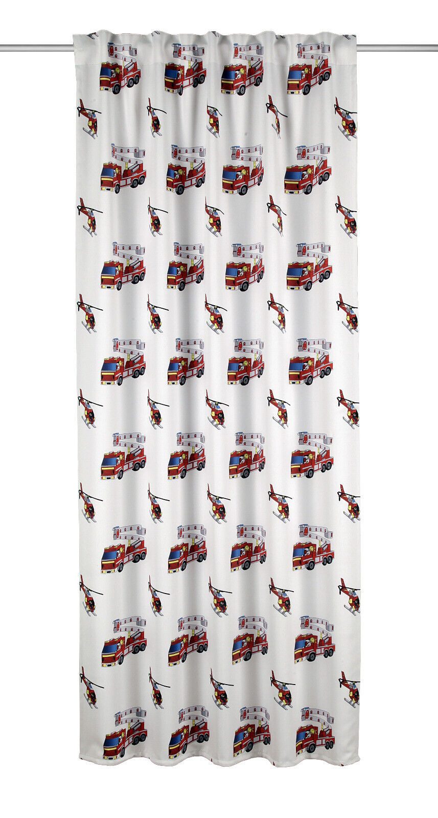 Verdunkelungsvorhang Model Feuerwehr mit optimalen Schallschutz sowie Wärme- und Kälteschutz. Der Vorhang ist mit einem Kombiband ausgestattet, d.h. Sie können die Gardine an vorhandene Gardinenstangen oder auch an Gardinenschienen aufhängen. Der Vorhangstoff ist besonders dicht gewebt, absolut blickdicht. Die Vorderseite ist mit Feuerwehrmotiven bedruckt, die Rückseite ist offwhite.