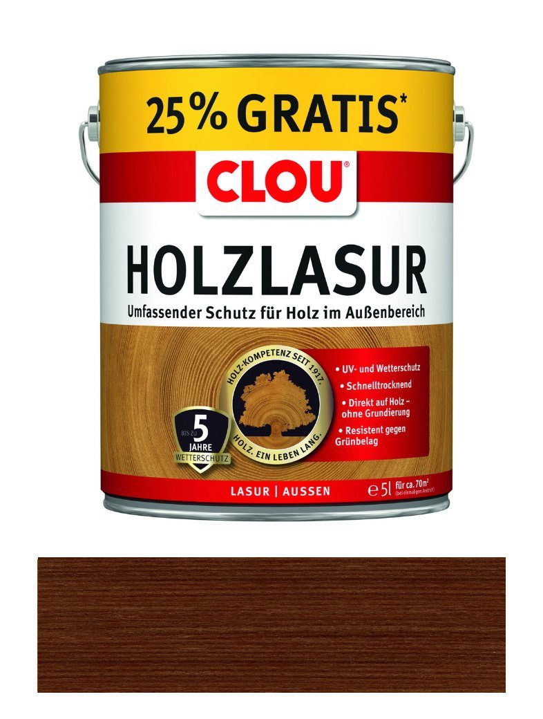 CLOU Holzlasur 5 Liter Farbton: Kiefer, Palisander, Nussbaum, Eiche Hell, Teak Eigenschaften: Bis zu 5 Jahre Schutz - Abhängig von der Konstruktion, Wetterbelastung und einer sachgemäßen Verarbeitung. Zur sachgemäßen Verarbeitung bitte die Hinweise auf dem Etikett und dem Technischen Merkblatt beachten. Dringt tief ein – kein Reißen und Abblättern. Beugt Grünbelag vor. Tropf- und spritzgehemmt– ideal für Arbeiten über Kopf. Anwendungsbereiche: CLOU Holzlasur ist der Allwetterschutz für eine Vielzahl von Holzobjekten im Außenbereich. Für begrenzt maßhaltige und nicht maßhaltige Bauteile aus Holz wie z.B. Zäune, Sichtblenden, Fassaden, Carports, Garten- und Blockhäuser. Vorbereitung: Allgemein sollte die Holzfeuchte nicht größer 20% betragen. Der Untergrund muss sauber, tragfähig, trocken, öl-, wachs- und fettfrei sein. Harzreiche Hölzer mit Nitroverdünnung abwaschen. Holz vor dem ersten Anstrich anschleifen. Vergraute, verwitterte Holzoberflächen bis auf das gesunde, tragfähige Holz abschleifen. Staub- und Schmutzreste vom Holz ausbürsten. Neue Holzbauteile: Glatte Holzoberflächen in Faserrichtung schleifen, gründlich reinigen, austretende Holzinhaltsstoffe wie z. B. Harze und Harzgallen entfernen. Harthölzer, Exoten und harzhaltige Weichhölzer vor dem Streichen mit Nitro-Universal Verdünner gründlich abwaschen. Sonst Holz nur säubern und Nadelhölzer mit Holzschutzgrund vorstreichen. Durch Probeanstrich Farbton und Verträglichkeit mit dem Untergrund prüfen. Unbehandeltes, altes Holz: Vergraute, verwitterte Holzoberflächen bis auf das gesunde, tragfähige Holz abschleifen, gründlich reinigen. Beschichtetes Holz: Altbeschichtungen wie Lacke und Dickschichtlasuren bis auf die saugfähige Holzoberfläche entfernen. Festhaftende Dünnschichtlasuren anschleifen, reinigen und auf Verträglichkeit mit CLOU Holzlasur. Verarbeitung: Erstanstrich im Außenbereich mit Holzschutzgrund. Zweit und Drittanstrich CLOU Holzlasur in Holzmaserrichtung 2x unverdünnt satt auftragen. An Stirnseiten und Schnittkanten mindestens 1x zusätzlich behandeln. Geeignete Pinsel und Streichwerkzeug auf Objektgröße abstimmen. Ergiebigkeit: 750 ml Inhalt reicht für ca. 10 m² je nach Saugfähigkeit des Untergrundes, Anwendungsbereich und gewünschter Farbtiefe bei einmaligem Anstrich. Trocknung: Bei 20 °C nach ca. 3 Stunden überstreichbar, durchgetrocknet und belastbar nach ca. 24 Stunden. Lagerung: Kühl und trocken lagern bei einer Mindesttemperatur von +5°. Anbruchgebinde gut verschließen und kindersicher aufbewahren.