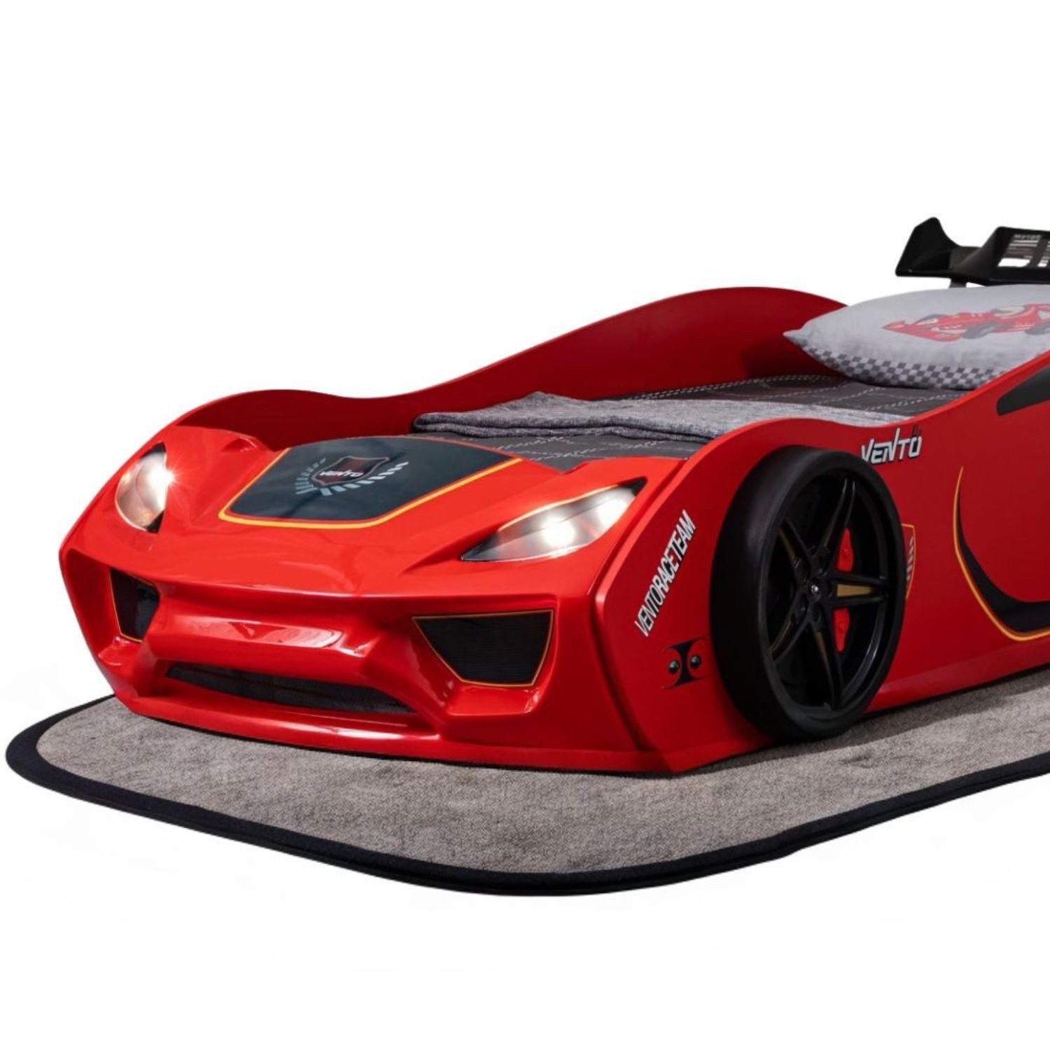 Unser Rennwagen-Autobett Vento ist der Star im Kinderzimmer. Das Vento Kinderbett bringt Rennfahrerfeeling und überzeugt durch Optik und Konstruktion. Die Möbelplatten sind massive 18 mm dick. Die Front ist aus hochwertigem Kunststoff gefertigt. Der Bolide hat eine markante Front und einen starken Spoiler. Die Front hat LED-Frontscheinwerfer und kann einfach über den Netzstecker eingeschaltet werden. Die praktischen Frontscheinwerfer können auch als Nachtlicht für Ihr Kind genutzt werden. Die Liegefläche ist 90 x 200 cm groß. Das Bett ist mit passendem Rollrost und Spoiler ausgestattet. Der Vento wird mit Racing Design Aufklebern geliefert, um das Gesamtbild zu vervollständigen. Das Bett kann man in Rot und Weiß kaufen.