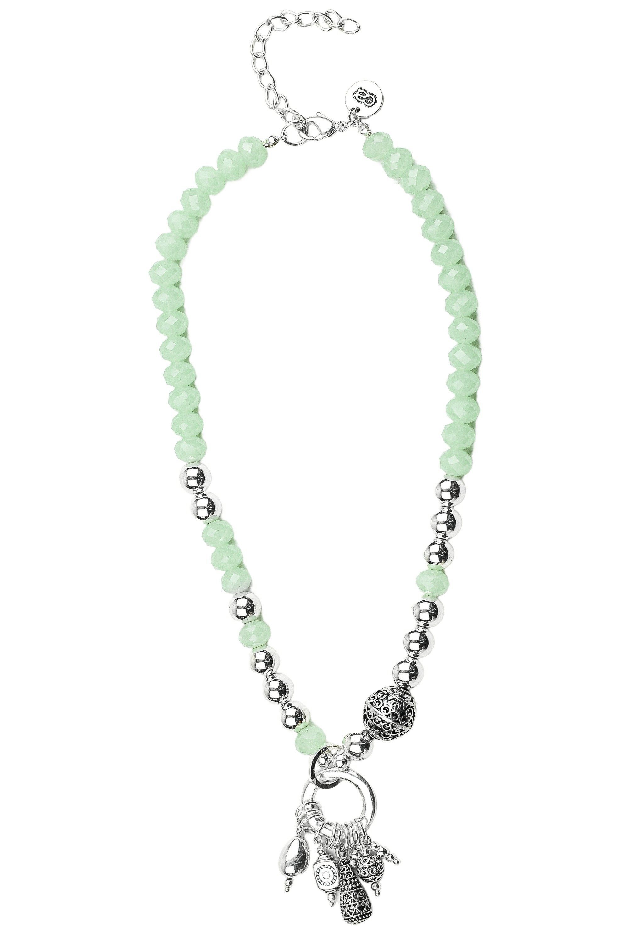 Die Kette besteht aus hochwertigen Perlen, die mit einem praktischen Karabinerverschluss versehen sind. Ein besonderes Highlight sind die facettierten Glasperlen, die dem Design eine subtile Eleganz verleihen. Ergänzt wird die Kette durch kleine Charmanhänger, die für einen verspielten und einzigartigen Look sorgen.