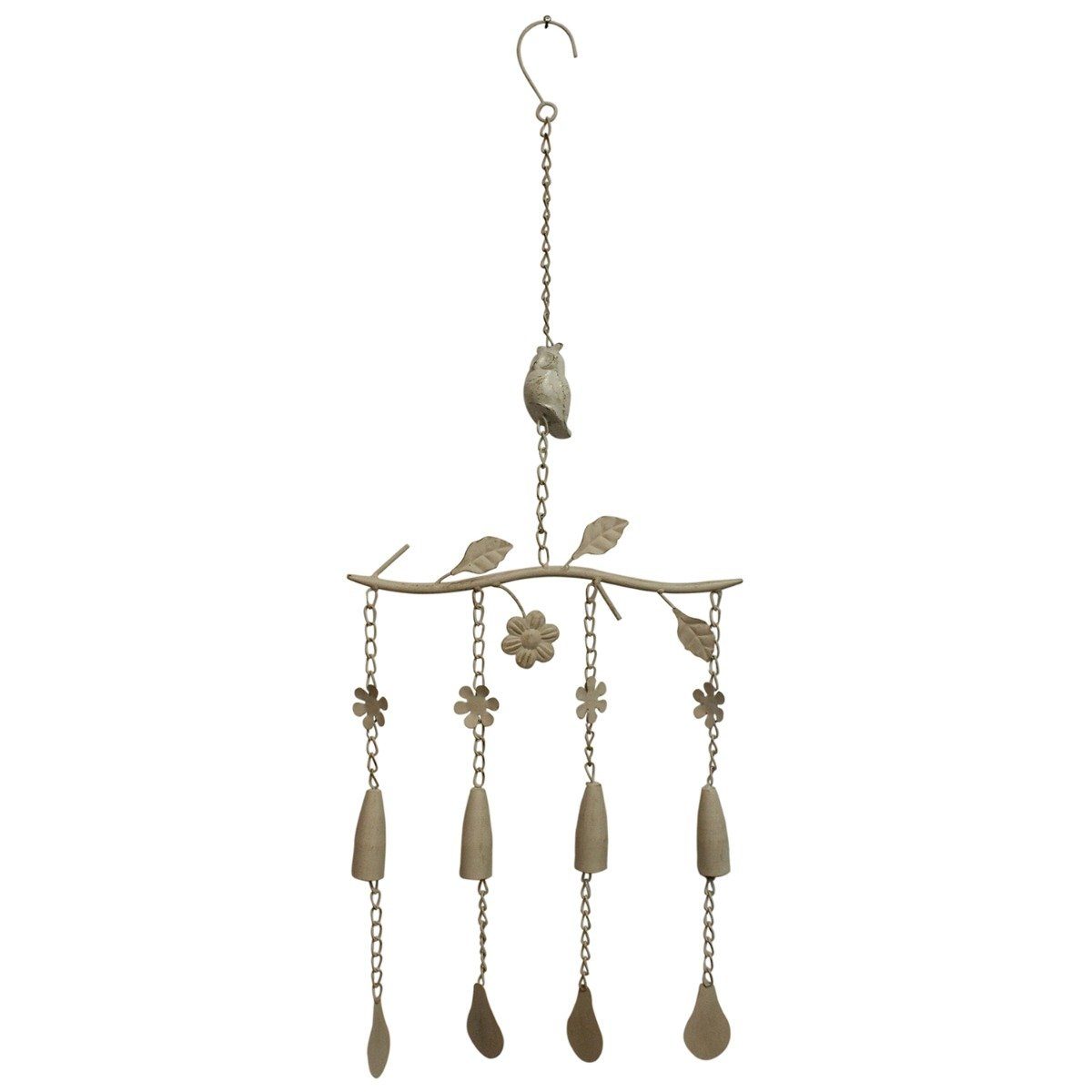 Eine schöne Deko-Idee für den Garten oder die Terrasse ist dieses detailreich gestaltete Klangspiel. Das filigrane Windspiel aus Metall erzeugt bei ausreichend Wind einen zauberhaften Klang. Eine kleine Eule aus massivem Metall befindet sich in der Mitte der oberen Kette und bringt das nötige Gewicht in das Klangspiel. Von einem leicht geschwungenen Zweig mit Blättern hängen vier Ketten herab. Sie sind jeweils mit einer Blüte, einer länglich geformten Glocke samt Klöppel und am unteren Ende mit einem tropfenförmigen Anfasser verziert. Damit bringen Sie das Windspiel auch dann zum Klingen, wenn der Wind mal nicht weht.