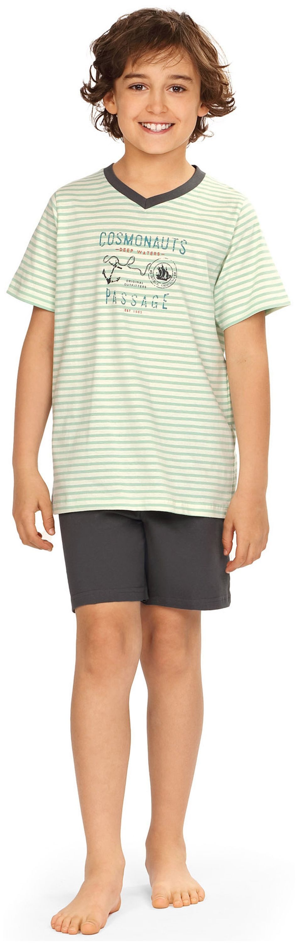 Dieser lange Jungenschlafanzug zeigt sich topmodisch und superbequem zugleich. Kurzer Schlafanzug für Jungen, Oberteil mit V-Ausschnitt, unifarbene Hose mit komfortablem Gummibund, in feiner Single-Jersey-Qualität.