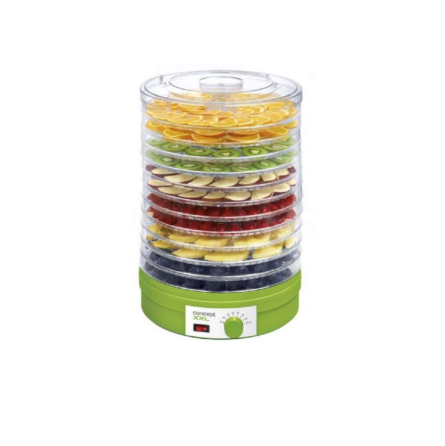 Das Gerät ist zum Trocknen von Lebensmitteln (Obst, Gemüse, Kräuter, Blumen, Pilze, Fleisch usw.) bestimmt. Während des Trocknens der Lebensmittel wird Wasser verdampft. Das Gerät nutzt das Prinzip der gleichmäßigen Strömung von warmer Luft, so dass die Lebensmittel nicht anbrennen und gleichmäßig getrocknet werden. Wenn Sie das in Scheiben geschnittene Obst in einer schwachen Lösung aus Zitronensaft einweichen, behält das Obst seine helle Farbe und wird nicht braun.
