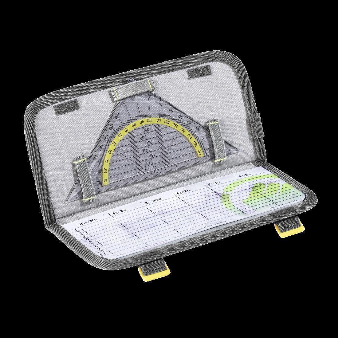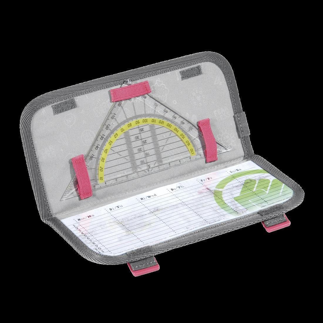 • Auf dem klappbaren Flap können Stifte, Lineal, Zirkel, Stundenplan und Geodreieck verstaut werden