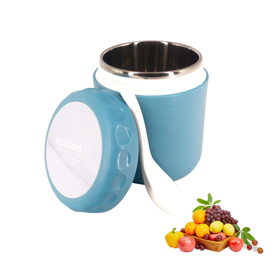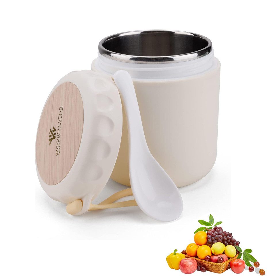 Verbesserter isolierter Lebensmittelbehältermacht es einfach, in die Tasse zu gießen und sie zu reinigen. Außerdem ist es einfach, direkt aus dem Behälter zu essen, anstatt die Speisen in einen anderen Behälter zu transferieren. Zudem hat der isolierte Lebensmittelbehälter eine Silikonumrandung am Boden, um Dellen zu vermeiden und auf glatten Oberflächen Halt zu bieten.