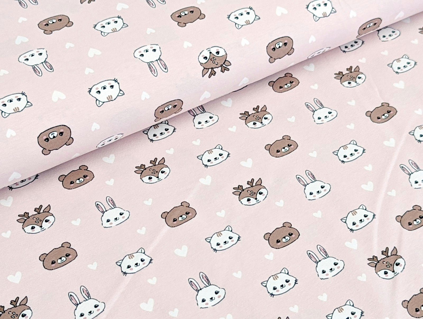 Stoff Baumwolljersey Süße Tierköpfe Lachs Stoff Meterware Kleiderstoff