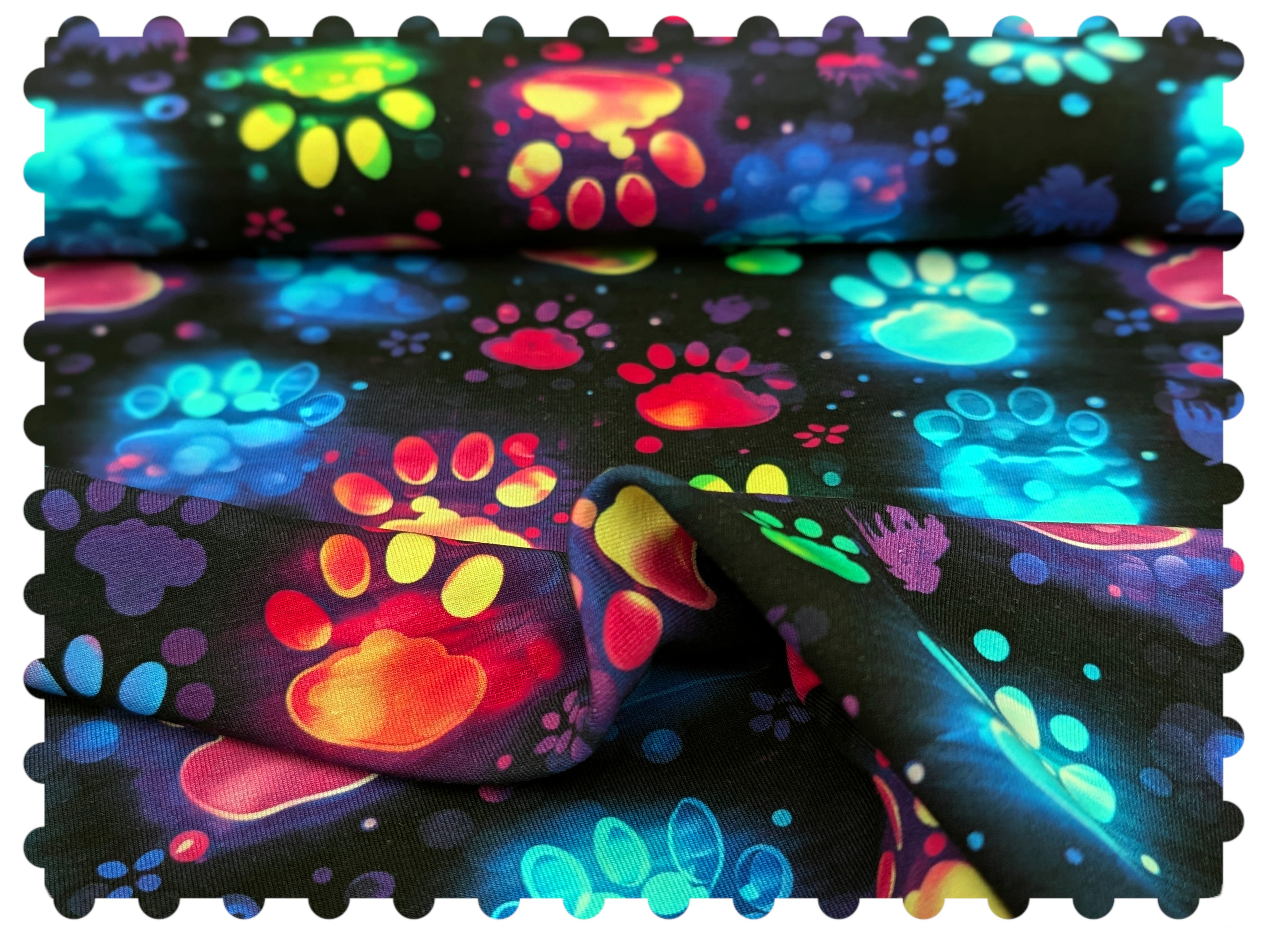 Baumwolljersey Neon Pfötchen auf Schwarz