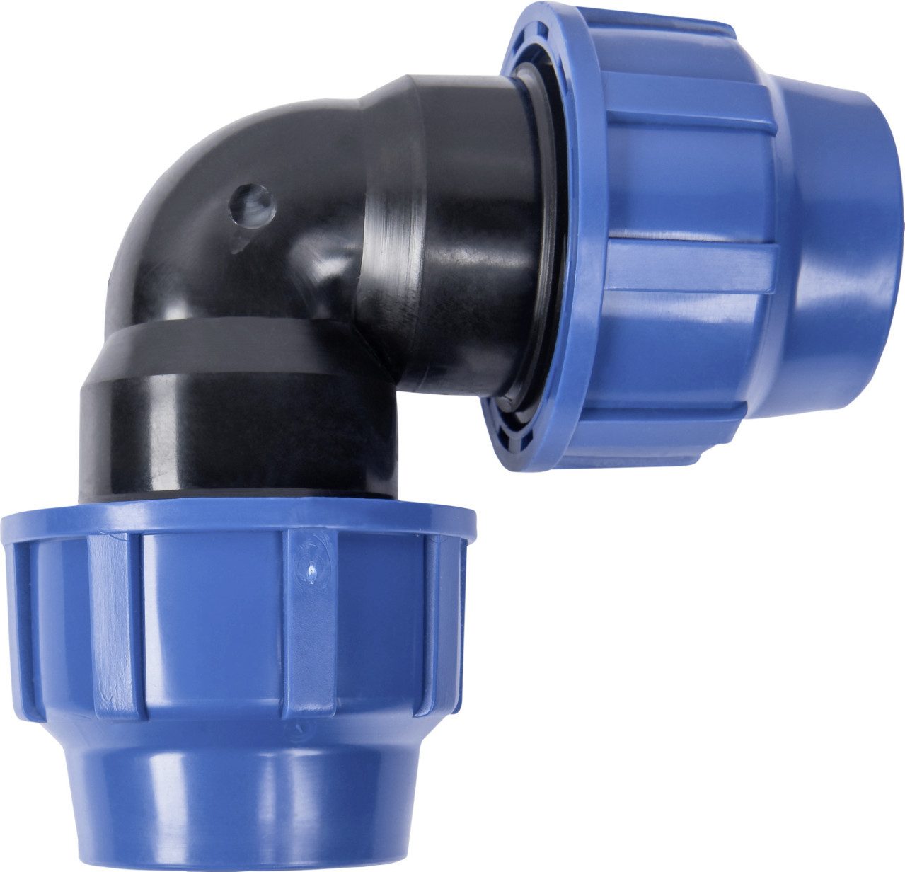 Winkel für PE-HD-Rohr Für Kaltwasser, DVGW zertifiziert und für Trinkwasser zugelassen, UV-beständig, Betriebsdruck bei 20° C max. 16 bar, Beständig gegen Korrosion, unempfindlich gegen Ablagerungen und Bakterienbefall, Einfache und schnelle Montage ohne Werkzeug, ø 20 mm