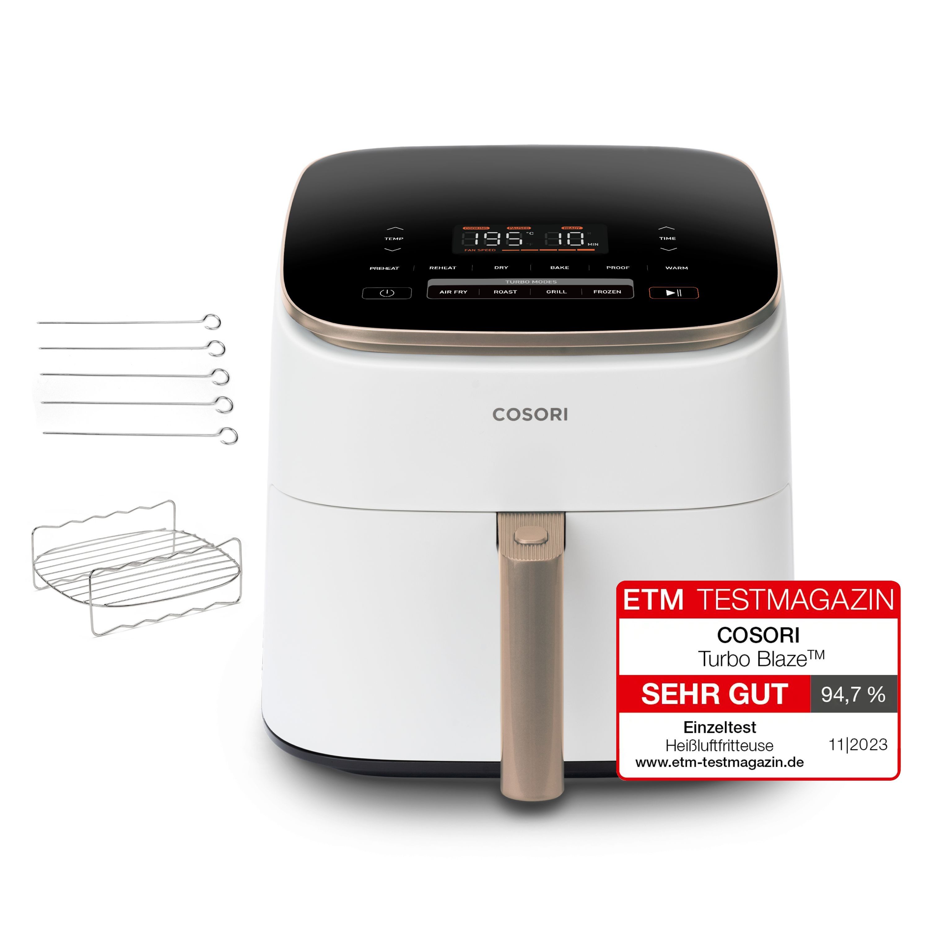 Wenn du dir den Cosori Turbo Blaze anschaffst, dann erhältst du nicht nur das Hauptgerät. Zusätzlich im Lieferumfang enthalten sind 5 Spieße, plus eine Spießhalterung. Diese kannst du z. B. für leckere Hähnchenspieße benutzen. Einfach das Hähnchenfleisch mit Gemüse deiner Wahl aufspießen und anschließend in der Heißluftfritteuse zubereiten und genießen. Damit du deine Gerichte langfristig mit gleichem Ergebnis zubereiten kannst, bekommst du von uns noch eine Crisper-Platte dazu. Diese besteht aus Kohlenstoffstahl, der stark, langlebig ist und nicht rostet.