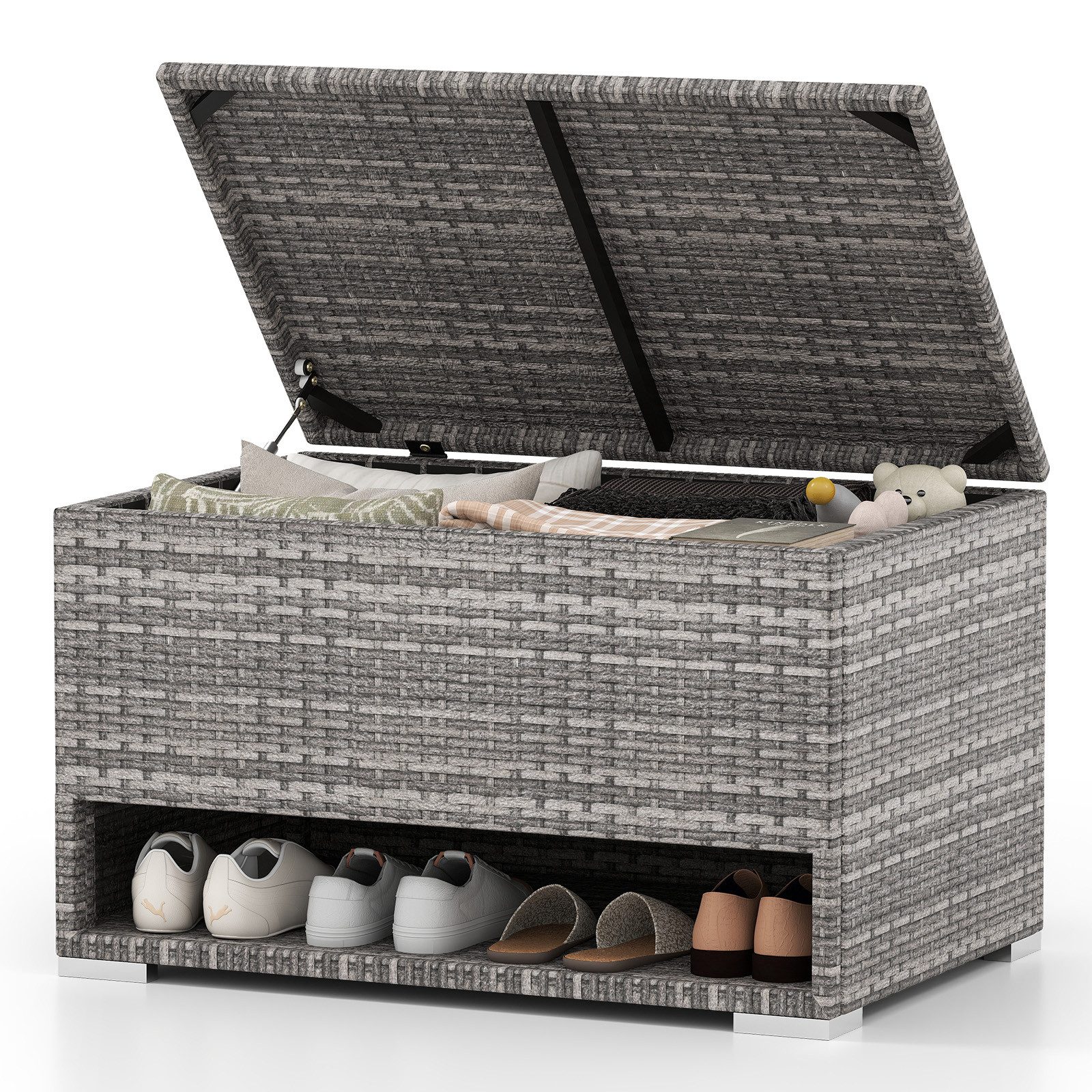 Mit einem geräumigen Hauptfach und einem praktischen unteren Schuhregal ist diese Aufbewahrungslösung perfekt, um alles von Schuhen bis zu Poolzubehör zu organisieren. Gefertigt aus sonnenfestem schwarzem PE-Rattan mit einem schützenden Reißverschluss-Liner, gewährleistet die Terrassenbox die Langlebigkeit und Sicherheit Ihrer Außenutensilien. Darüber hinaus bietet der einfach zu hebende Deckel, unterstützt durch stabile metallscharniere und eine Gasfeder, einen mühelosen Zugriff. Platzieren Sie diese elegante und praktische Aufbewahrungsbox mit hervorragend gefertigten Details in jedem Außenbereich, um Ihren Raum ordentlich und stilvoll zu halten.