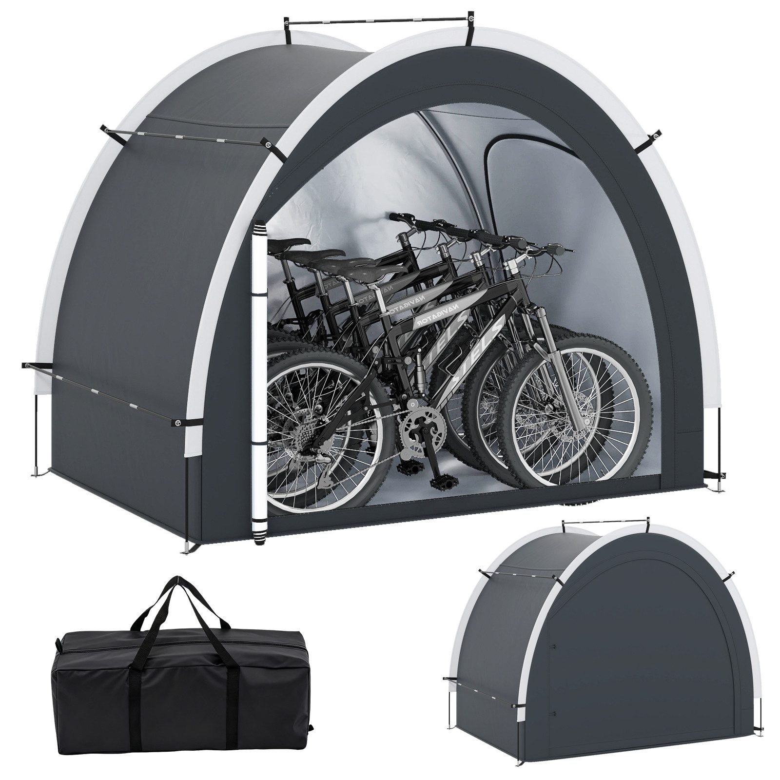 Benötigen Sie eine zuverlässige Aufbewahrungslösung für Ihre Fahrräder und Outdoor-Ausrüstung? Unsere Fahrradgarage ist aus Oxford-Gewebe mit einer wasserbeständigen, sonnenschützenden Silberbeschichtung gefertigt. Mit den Maßen 218 x 153 x 182 cm bietet es Platz für 4-5 Fahrräder sowie verschiedene Werkzeuge und Spielzeuge. Die mit Reißverschluss verschließbare Vordertür und ein Seiteneingang ermöglichen einfachen Zugang und sichere Abdichtung, während Aufbewahrungstaschen für Ordnung sorgen. Der stabile Fiberglasrahmen, verstärkt mit Bodenankern und Abspannseilen, hält jedem Wetter stand.