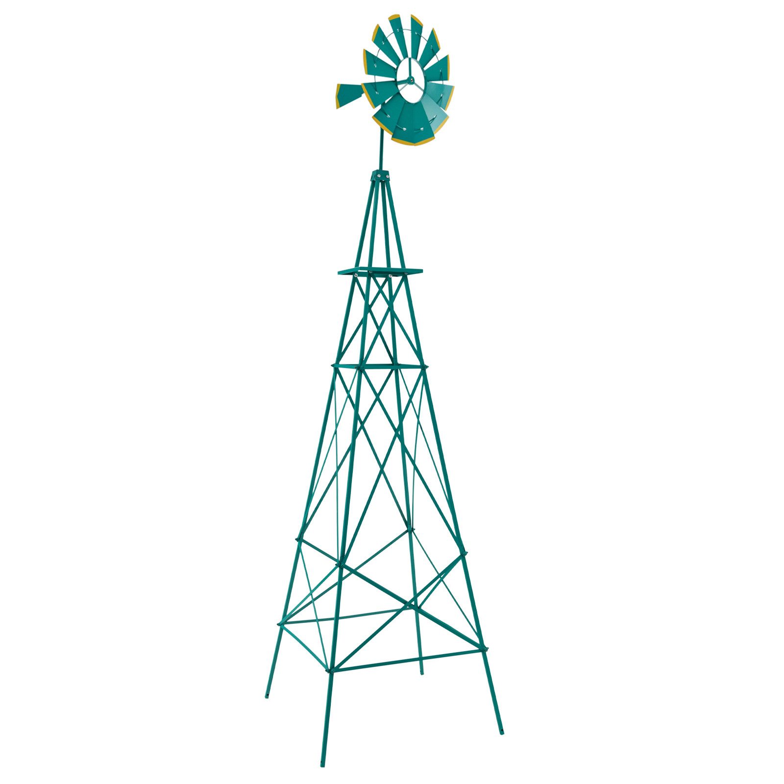 Die robuste Metallkonstruktion für alle Wetterbedingungen garantiert eine lange Lebensdauer, sodass Sie sich das ganze Jahr über an ihrer Schönheit erfreuen können. Das funktionale Wetterfahnen-Feature verschönert nicht nur Ihren Garten, sondern informiert Sie auch über die Windrichtung. Mit stabilen Stützbeinen und 4 Bodenankern steht diese gut gefertigte Windmühle stabiler. Diese dekorative Windmühle verspricht, herauszustechen und ein geschätzter Bestandteil Ihrer Außendekoration zu werden. Erhöhen Sie den Charme Ihres Außenwohnraums mit diesem auffälligen und funktionalen Windmühlen-Mittelpunkt.