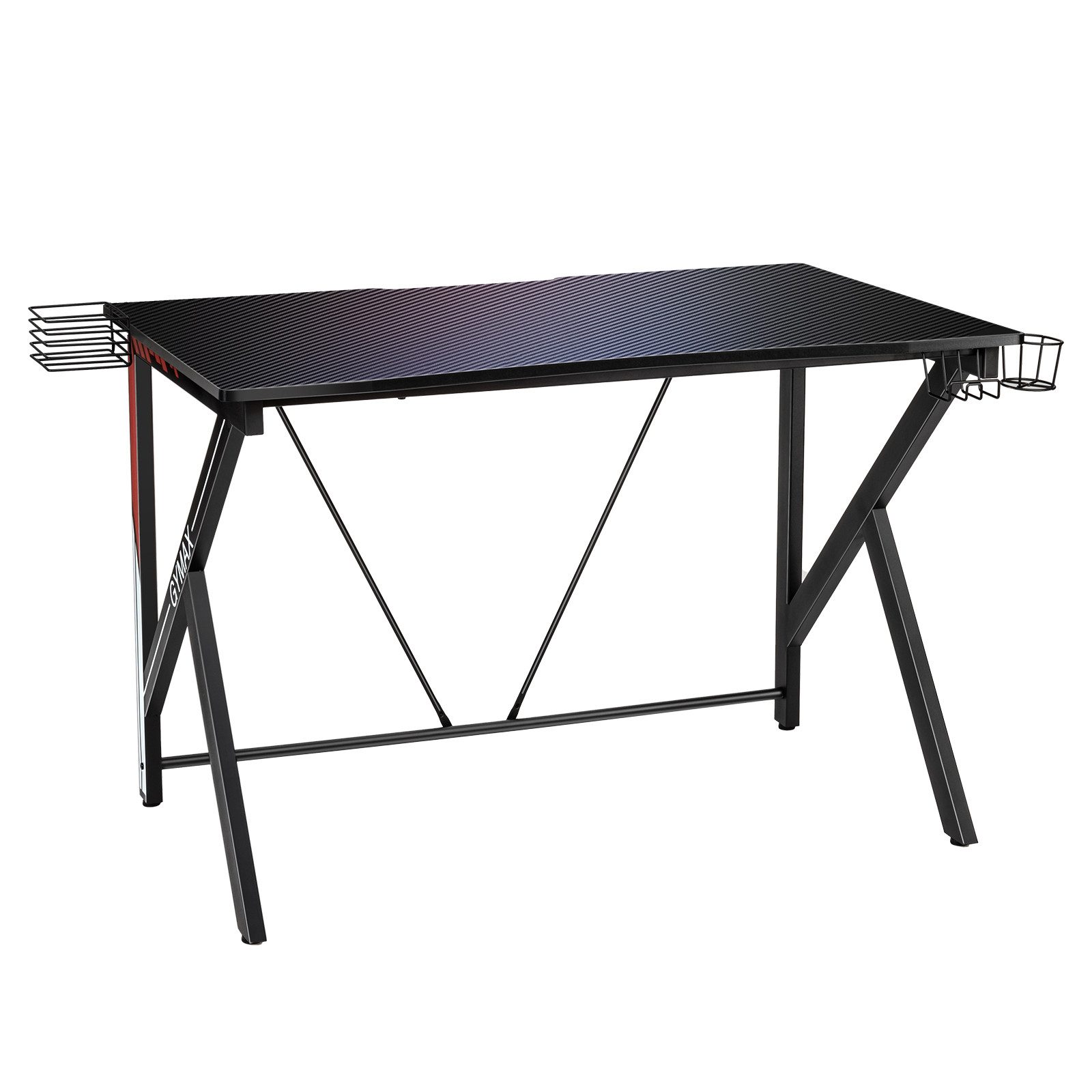 Unser Gaming-Tisch ist die ideale Wahl für ein spannendes Spiel! Hergestellt aus hochwertigem MDF und gestützt von einer K-förmigen Struktur, ist dieser er kann bis zu 100 kg tragen. Die geräumige Tischplatte bietet viel Platz für Ihre gesamte Ausrüstung. Ein Kabelführungsloch sorgt für Ordnung. Darüber hinaus ist es erwähnenswert, dass dieser Tisch auch mit einer Ablage, einem Becherhalter und einem Kopfhörerhaken ausgestattet ist, was den Komfort stark erhöht. Verbringen Sie Ihre Gaming-Zeit mit unserem funktionalen Schreibtisch!