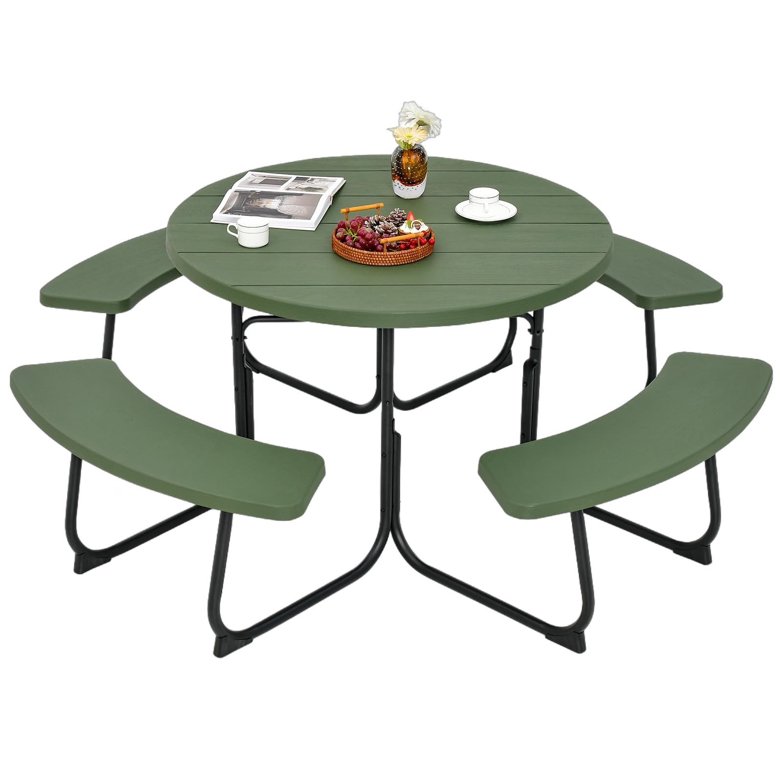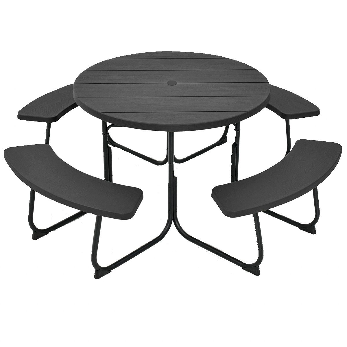 Mit einer geräumigen Tischplatte und 4 langen Bänken bietet unser Picknicktisch Platz für 8 Personen zum gleichzeitigen Essen und ist somit eine gute Wahl für Picknicks im Freien. Der stabile Picknicktisch wird von einem pulverbeschichteten Metallgestell getragen und sorgt so für außergewöhnliche Stabilität. Im Gegensatz zu anderen Tischen mit Holzplatte besteht unsere aus hochwertigem HDPE-Material, das wasserdicht und rissbeständig ist und somit eine dauerhafte Nutzung ermöglicht. Zudem ist das zentrale Loch und die Stangenhalterung praktisch für die Montage eines Terrassenschirms. Das Schirmloch ist abgedeckt, sodass die Nutzung des Tisches auch dann nicht beeinträchtigt wird, wenn der Schirm nicht verwendet wird.