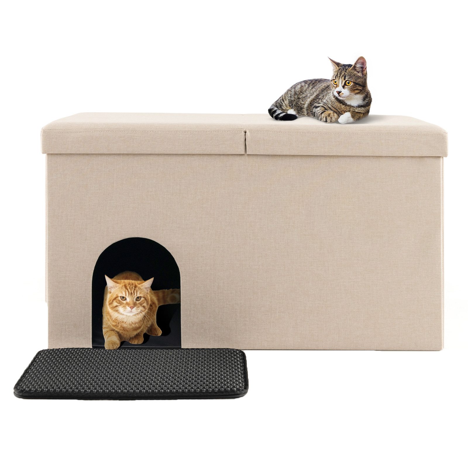 Unser Katzenklo verfügt über einen Geruchsfilter zur Geruchskontrolle und hinterlässt so einen frischen Duft in Ihrem Zuhause. Und der hochklappbare Deckel ermöglicht es Ihnen, Katzenstreu mühelos nachzufüllen. Mit seiner 2-lagigen Katzenstreu-Matte mit wabenförmigem Design verhindert der Katzen-Waschraum, dass Katzenstreu über Ihre Böden verteilt wird. Das wasserdichte Innenfutter sorgt für einen sauberen und trockenen Raum für Ihre Haustiere. Außerdem besteht der Waschraum aus strapazierfähigem Oxford-Hanf für eine dauerhafte Verwendung. Der rutschfeste Boden sorgt dafür, dass die Katzenstreu-Matte an Ort und Stelle bleibt, wenn Ihre Katzen darauf laufen, und reduziert so Unordnung. Aber die Katzenklo-Verkleidung ist nicht nur ein versteckter Katzen-Waschraum, sondern auch ein multifunktionales Katzenmöbel. Mit einem abnehmbaren Trennwand können Sie es für einen großen privaten Raum montieren oder entfernen, um zusätzlichen Stauraum zu schaffen.