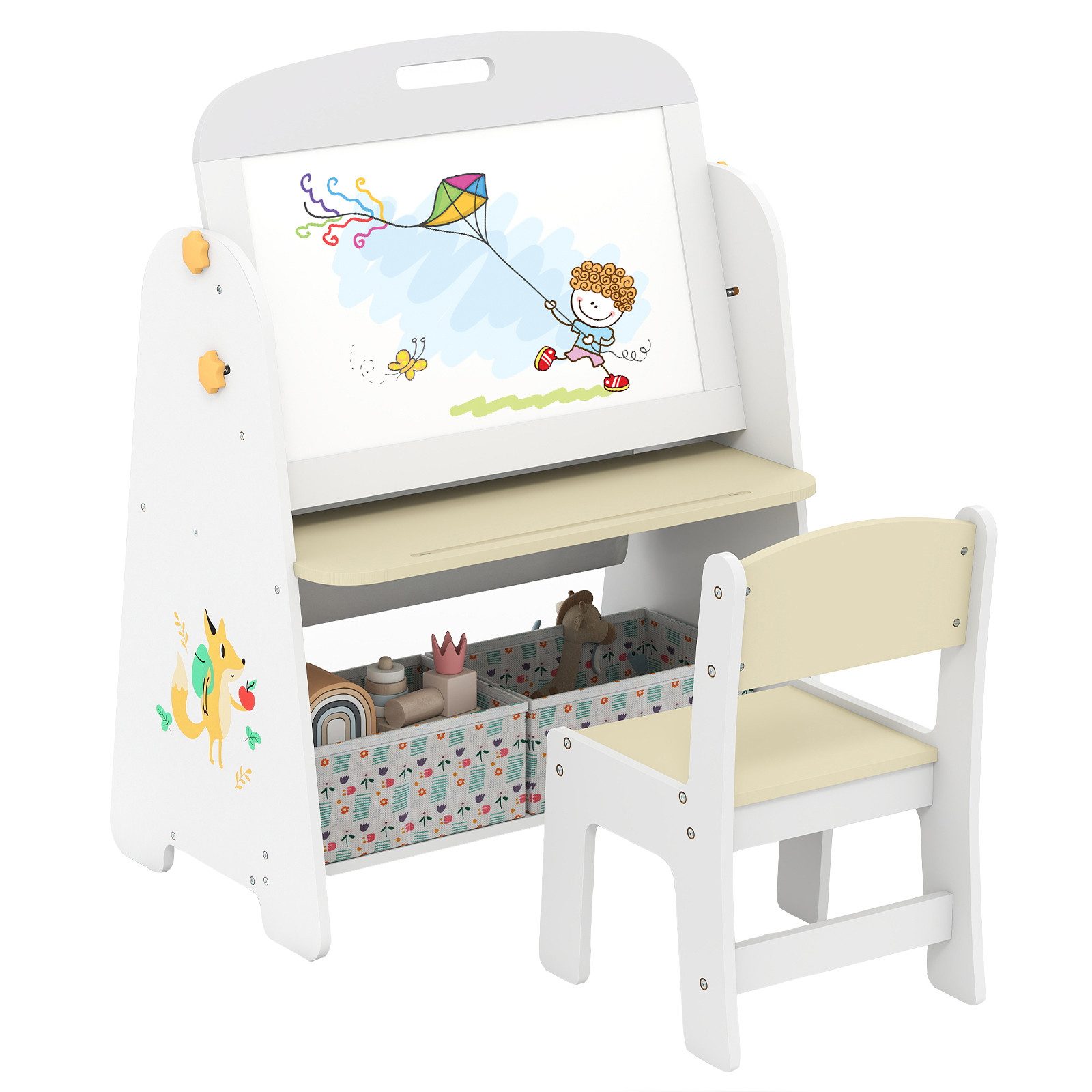 Verbessern Sie die Kreativität und Organisation Ihres Kindes mit diesem 4-in-1-Kindertisch- und Stuhlset. Mit einer magnetischen Weißtafel und einer Tafel bietet dieses Schreibtischset für Kinder einen multifunktionalen Raum für künstlerische und pädagogische Aktivitäten. Die großzügigen Aufbewahrungsoptionen, darunter ein Bücherregal und Stoffkisten, halten Materialien wie Bücher, Spielzeug, Papier, Buntstifte, Marker und Kreide ordentlich. Schenken Sie Ihrem Kind einen inspirierenden und lehrreichen Raum für stundenlangen Spaß und Lernen.