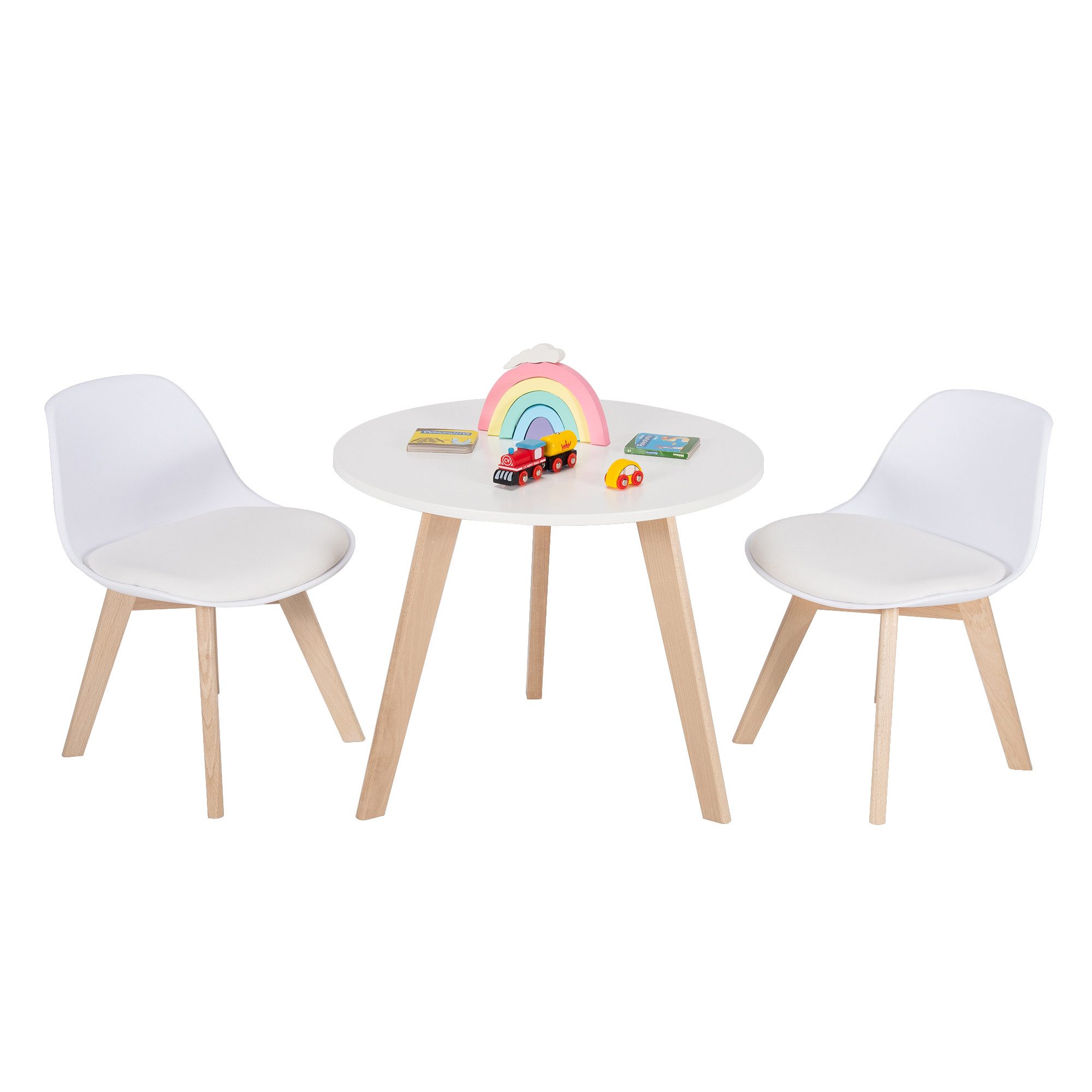 Suchen Sie ein Kindermöbelstück für Ihren Engel? Schauen Sie sich dieses 3-teilige Tisch- und Stuhlset an! Es besteht aus einem runden Tisch und 2 ergonomischen Stühlen, die aus hochwertigem MDF und massivem Buchenholz gefertigt sind, um die Lebensdauer zu verlängern und das Wachstum Ihres Kleinen zu begleiten. Die Kanten des Tischs und der Stühle sind aus Sicherheitsgründen sorgfältig abgerundet und der Sitz ist für mehr Komfort weich gepolstert. Darüber hinaus trägt der Stuhl mit Rückenlehne dazu bei, dass Kinder die richtige Sitzgewohnheit entwickeln. Tatsächlich ist dieses Set für Kinder geeignet, die verschiedenen Aktivitäten nachgehen, und wird mit Sicherheit glückliche und unvergessliche Erinnerungen hervorrufen.