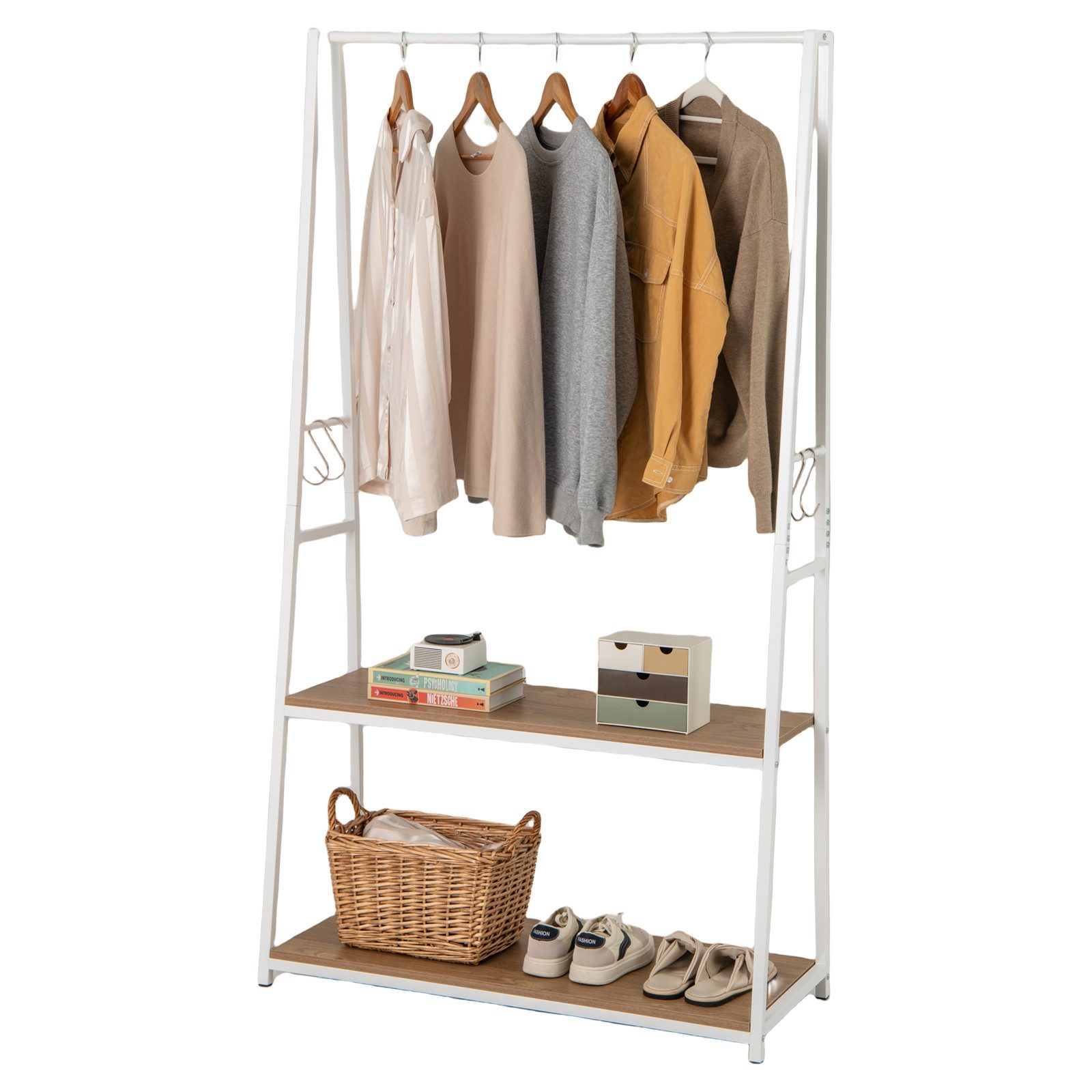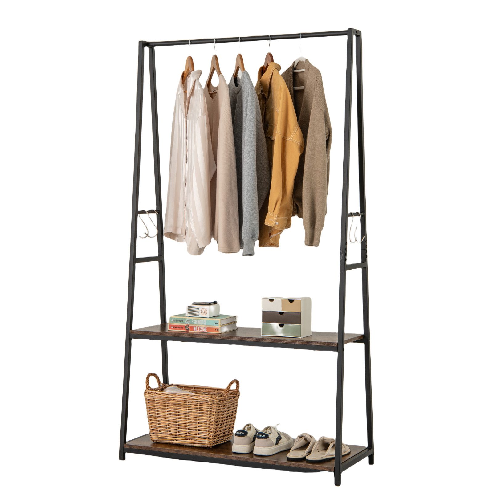 Verbessern Sie Ihre Wohnorganisation mit diesem vielseitigen Kleiderständer aus hochwertigem, rostbeständig beschichtetem Metall. Die robuste dreieckige Struktur gewährleistet Langlebigkeit und hohe Tragfähigkeit für zuverlässigen Service über viele Jahre. Die großzügige, unterteilte Aufbewahrung bietet effiziente Organisation mit einer Kleiderstange für Mäntel und Hemden sowie unteren Ablagen für Schuhe oder Boxen. Zusätzliche seitliche Kleiderstangen bieten Platz für Kopfhörer, Schals, Hüte oder Taschen. Mit seinem industriellen Stil passt dieses Regal in jede Einrichtung und ist ideal für Badezimmer, Schlafzimmer, Ankleidebereich oder Wohnzimmer geeignet. Dieses multifunktionale Aufbewahrungsregal wertet Ihren Wohnraum funktional und stilvoll auf.