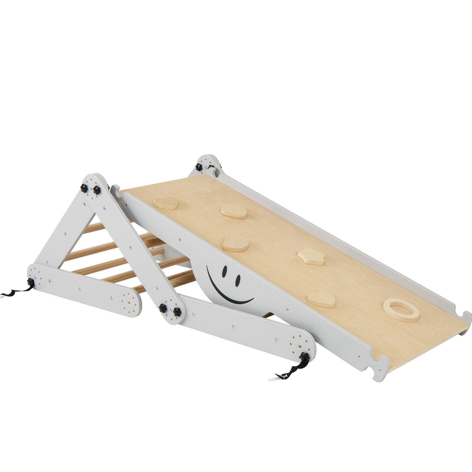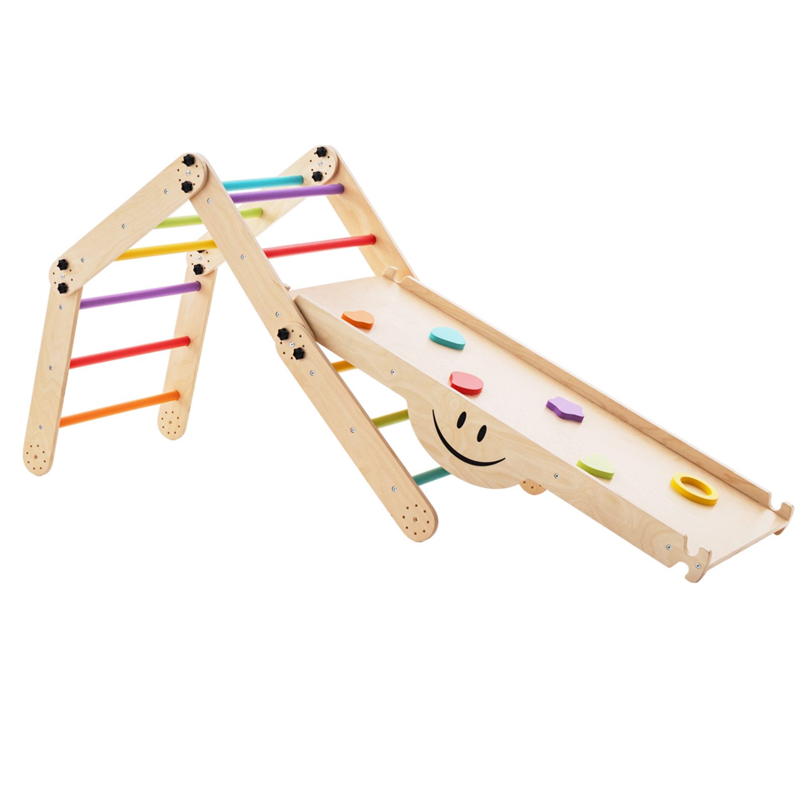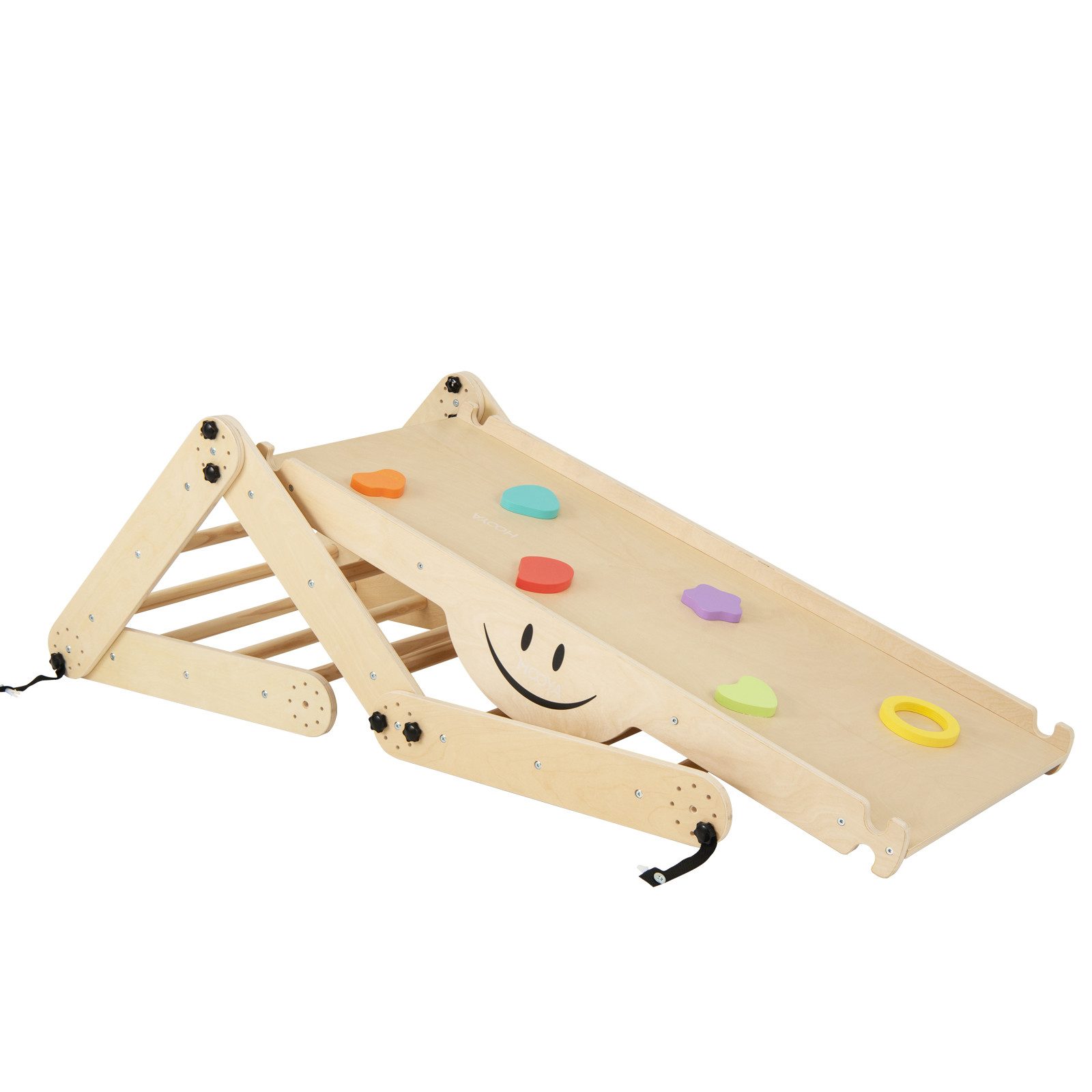 Das 5-in-1-Klettererset enthält einen wandelbaren Kletterer und eine doppelseitige Rampe, auf der Kinder klettern, krabbeln oder rutschen können. Der Kletterer lässt sich leicht in verschiedene Formen umwandeln, um den unterschiedlichen Spielbedürfnissen von Kindern gerecht zu werden. Und Sie können die Höhe der Rampe für das Rutschen oder Klettern anpassen. Darüber hinaus funktioniert die umkehrbare Rampe auch gut als Wippe, auf der Kinder wippen können. Und Kinder können damit im Kinderzimmer, Wohnzimmer, Spielzimmer, Kindergarten oder Kinderkrippe spielen. Massivholzstäbe und farbenfrohe Klettersteine helfen Ihrem Kleinen beim Klettern. Dieses Klettererset besteht aus hochwertigem Kiefernholzmaterial für den langfristigen Gebrauch und einer starken Tragfähigkeit von 60 kg. Außerdem ist es sicher und zuverlässig. Nach dem Gebrauch kann der Kletterer zu einer kompakten Form zusammengeklappt werden, um Platz zu sparen.