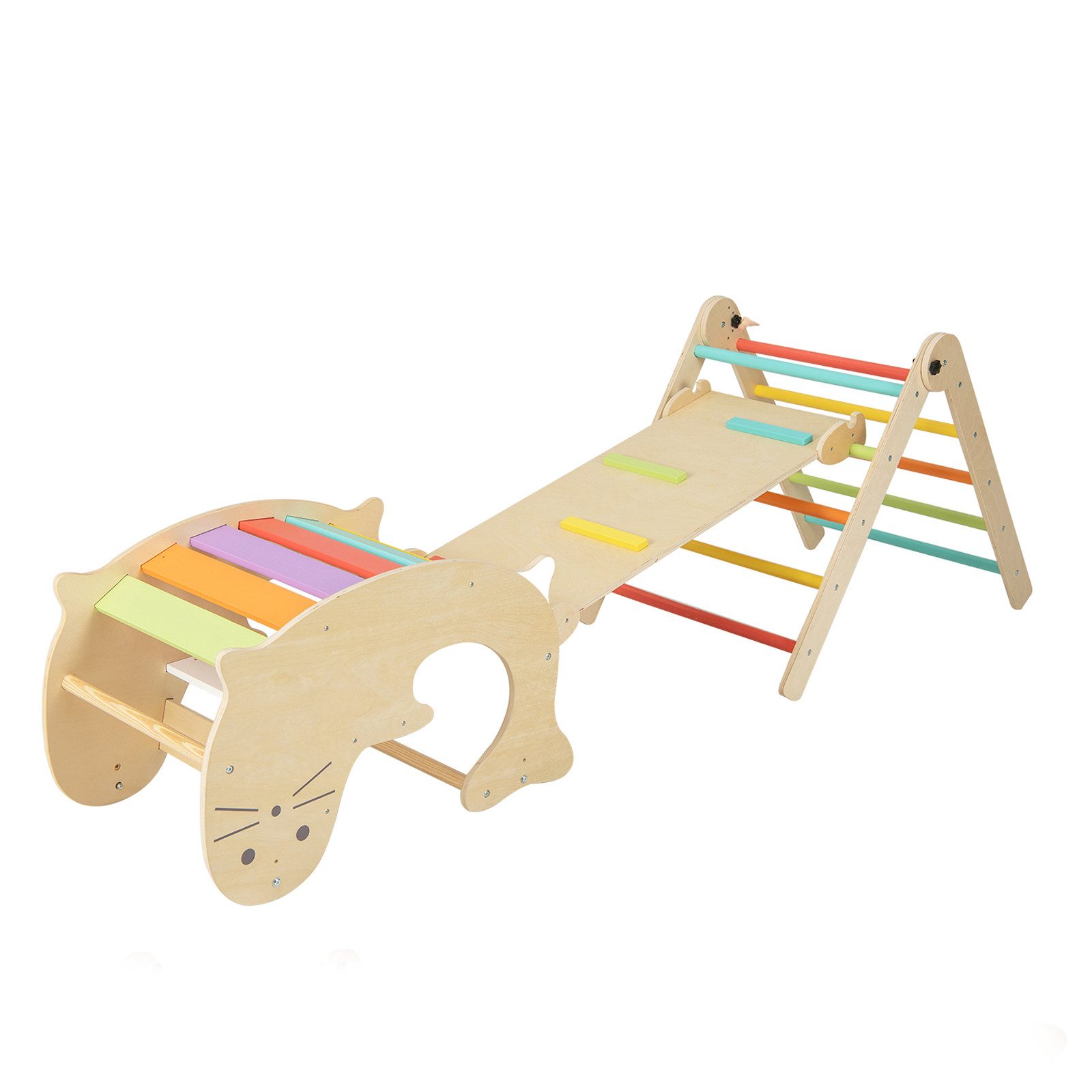 Dieses Kletterset bietet Kindern nicht nur 7 interessante Spielbereiche zum Erkunden, sondern trainiert auch ihre Muskeln und motorischen Fähigkeiten. Es verfügt über eine Kletterleiter, einen Krabbeltunnel, eine Rutsche, eine Kletterrampe, einen Kletterbogen, eine Seelöwenwippe und einen Spieltisch. Die Seelöwenwippe kann je nach Wunsch in einen Kletterbogen oder einen Kindertisch verwandelt werden, sodass Kinder nach Lust und Laune schaukeln, klettern oder spielen können. Außerdem sind die dreieckige Kletterleiter und die doppelseitige Rampe höhenverstellbar (3-stufig) und eignen sich für Kinder im Alter von 3 bis 14 Jahren. Aufgrund der Hartholzstangen ist jedes Teil bis zu 60 kg belastbar. Zu guter Letzt können Sie die Kletterleiter bei Nichtgebrauch einfach zusammenklappen und so platzsparend verstauen.