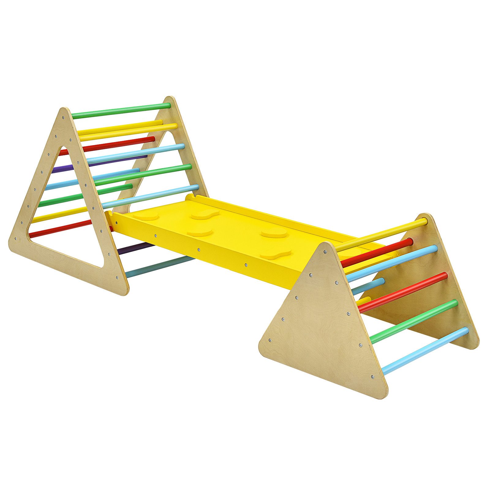 Es umfasst 1 große Dreiecksleiter, 1 kleine Dreiecksleiterund 1 Rampe. Diese ist doppelseitig und hat einestrukturierte Seite fürs Klettern, sowie eine glatte Seiter fürs Rutschen. Die 3 Teile können je nach Bedarf in verschiedenen Kombinationen genutzt werden.Aus natürlichem Holz bestehend und durch die stabile Struktursind die Teile sehr stabil und langlebig. Zudem werden dank der abgerundeten Kanten und dersicheren Farbe Verletzungen vermieden.Die kleine Leiter kann unter die große gestellt werden, um Platz zu sparen.
