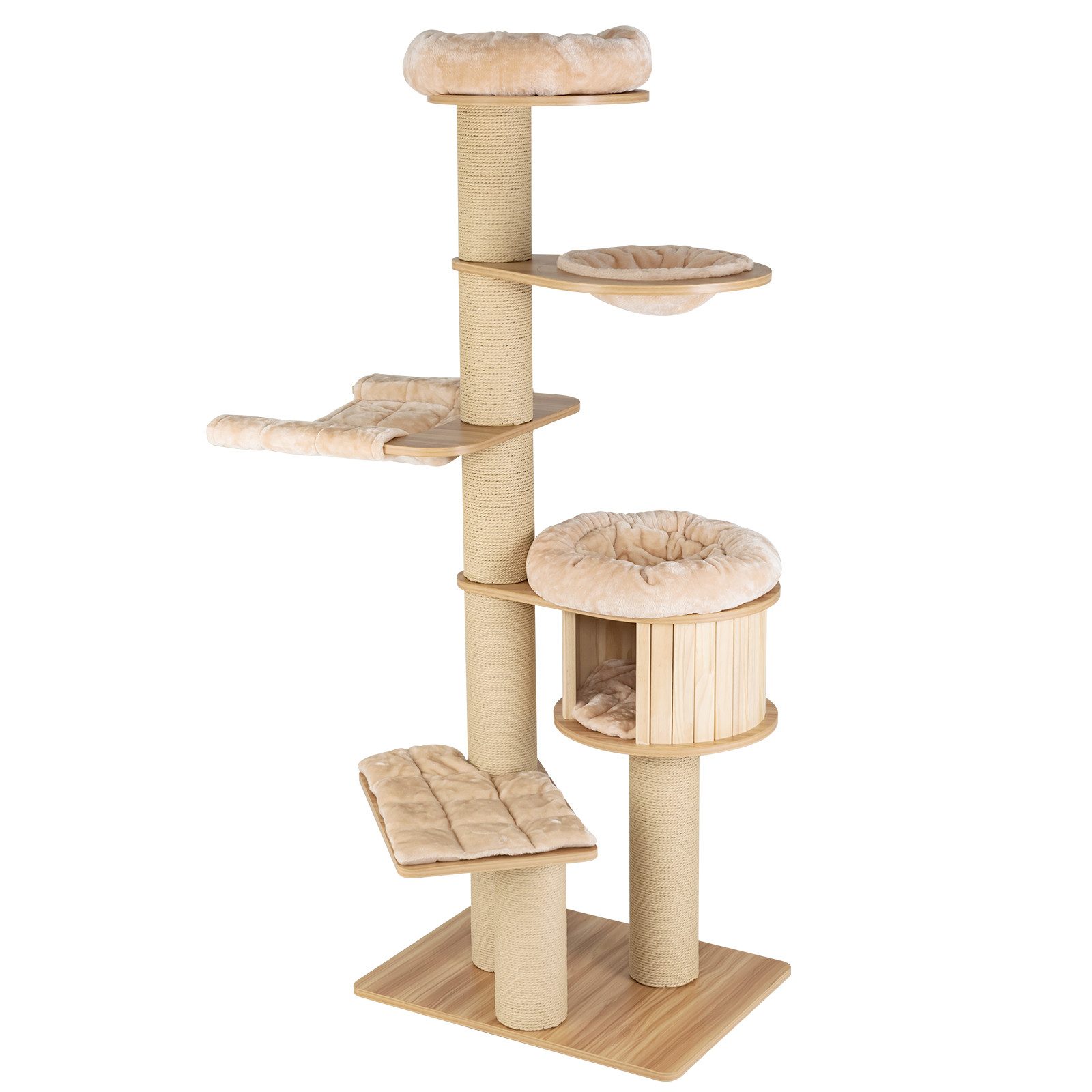 Werfen Sie einen Blick auf unseren unterhaltsamen Mehrzweck-Kratzbaum für Ihre pelzigen Freunde! Unser hoher Kletterbaum verfügt über ein kompaktes mehrstufiges Design, das ideal für Familien mit mehreren Katzen ist, um endlosen Spaß zu genießen. Die breite obere Sitzplattform, die gepolsterten Sprungplattformen, die Katzenhütte aus Massivholz, das bequeme Korbbett und die weiche Hängematte werden den Bedürfnissen von Katzen zum Ausruhen, Spielen, Springen und Schlafen voll und ganz gerecht. Darüber hinaus ist das Design komplett umwickelter Pfosten die perfekte Lösung zur Schonung Ihrer Möbel.