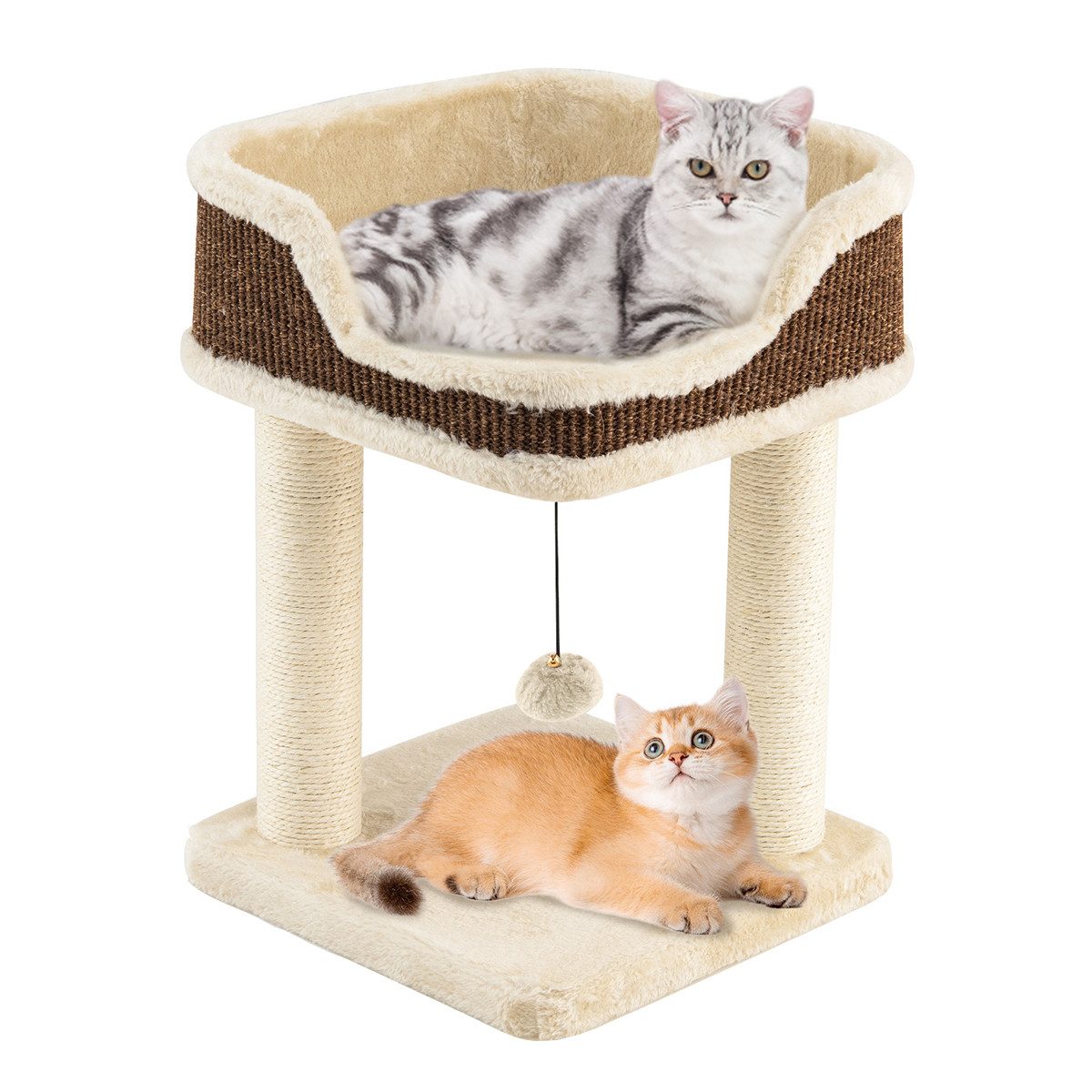Beobachten Sie, wie Ihre Katze ihre verspielte Seite mit dem kleinen Kratzbaum entfaltet! Der vielseitige Katzen-Aktivitätsbaum ist mit weichem Plüschmaterial überzogen und bietet einen gemütlichen und einladenden Raum für Ihr Kätzchen zum Ausruhen, Kratzen, Spielen und Trainieren. Die geräumige Sitzfläche ist halbgeschlossen und bietet ein Gefühl von Sicherheit, das es den Kätzchen ermöglicht, ungestört ein Nickerchen zu genießen. Darüber hinaus verfügt die Sitzfläche über einen Sisalteppich an der Außenwand, komplett mit Sisal-Kratzsäulen, die eine langlebige Kratzumgebung für Ihren pelzigen Freund bieten. Außerdem wird der baumelnde Ball Ihr pelziges Familienmitglied stundenlang unterhalten. Noch wichtiger ist, dass der Kratzbaum einfach zu montieren ist, sodass Ihr Kätzchen im Handumdrehen Spaß haben kann.
