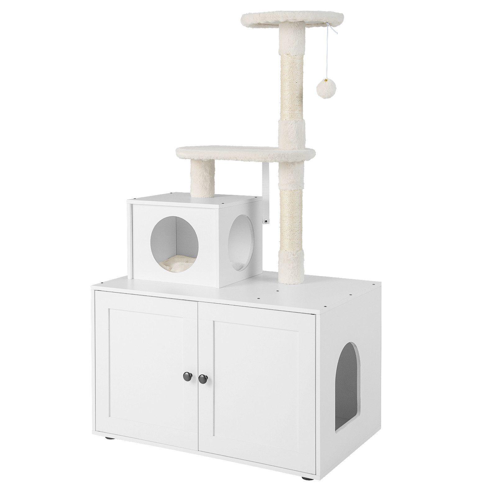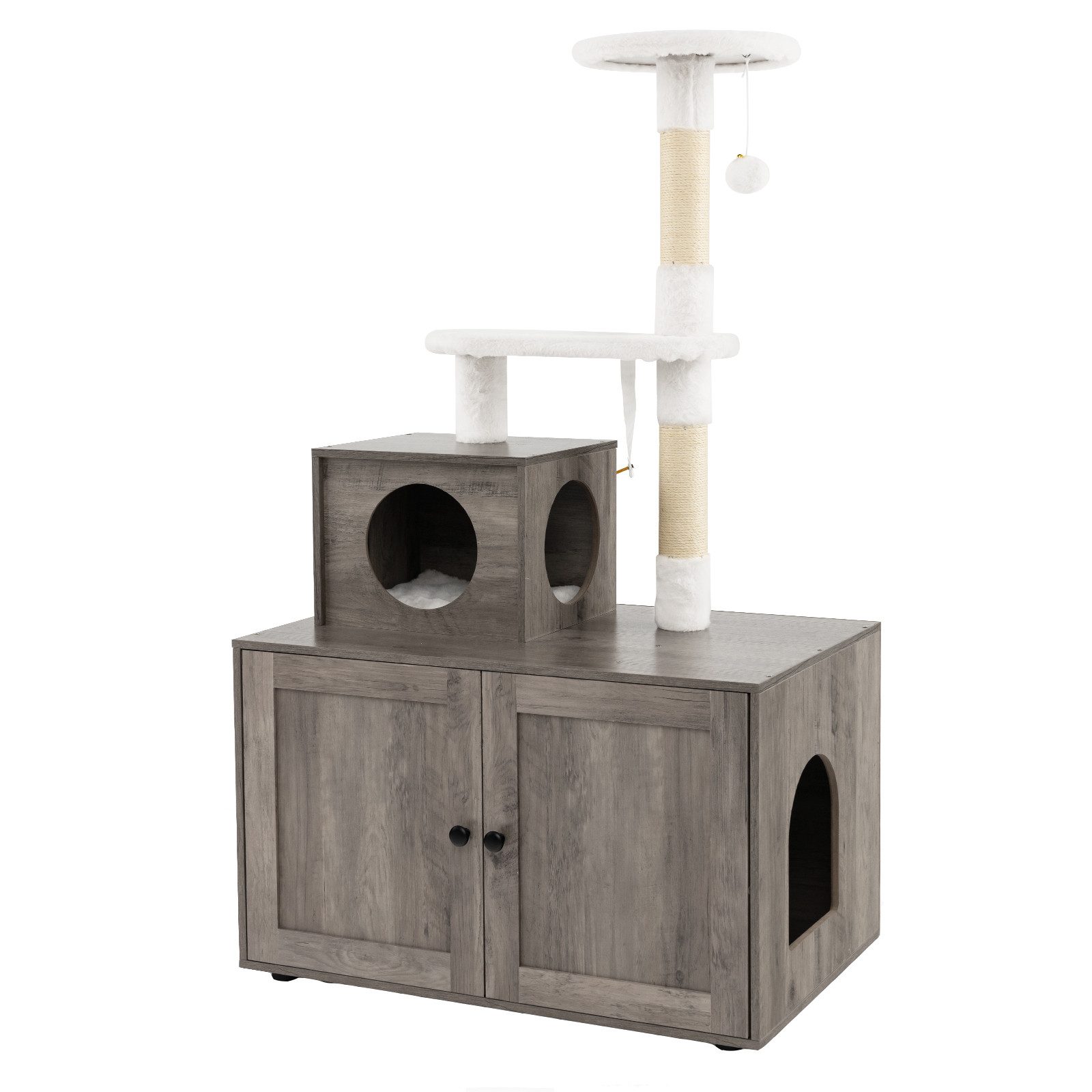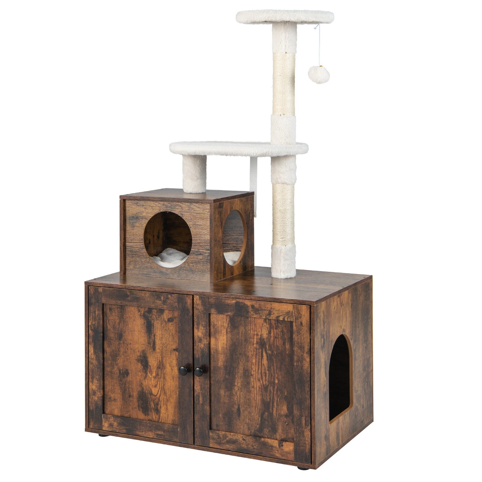 Unser All-in-1-Katzenmöbelstück umfasst ein Katzenklo-Gehäuse und einen Kratzbaum, der Ihrem pelzigen Freund ein privates Haus und ein lustiges Aktivitätszentrum bietet. Darüber hinaus verfügt es über ein amüsantes klimperndes Fellknäuel, bequeme Sprungplattformen und eine große Katzenhöhle, die den Bedürfnissen des Ausruhens, Kratzens, Springens und Spielens gerecht wird. Der Katzenschrank aus Holz kann verwendet werden, um eine Katzentoilette, ein Katzenbett oder verschiedene Utensilien zu verstecken. Zur Erhöhung der Stabilität ist der Katzenturm außerdem mit einer Kippsicherung ausgestattet, die ein Wackeln beim Auf- und Abspringen Ihrer Katzen wirksam verhindern kann.