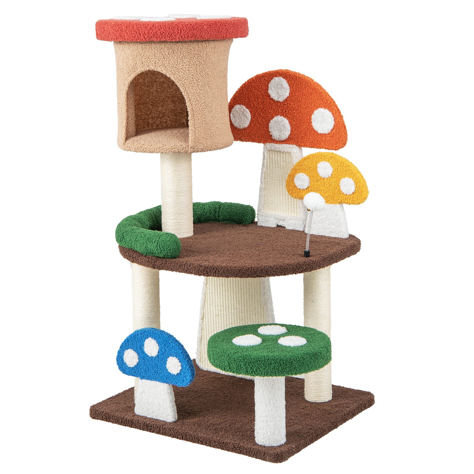 Beobachten Sie, wie sie sich selig in die geräumige Höhle des Katzenturms zurückziehen, die mit weichem Teddystoff und Schwammpolsterung den ultimativen gemütlichen Rückzugsort bietet. Das mehrschichtige Design lädt sie dazu ein, weite Plattformen zu erkunden und mit einem interaktiven Federball zu spielen und so ihre Beweglichkeit zu demonstrieren. Verabschieden Sie sich von zerkratzten Möbeln, denn die integrierten Sisalstämme und Kratzbretter sind aus haustierfreundlichen Materialien gefertigt und so konzipiert, dass sie die Instinkte Ihrer Katze entfesseln und für eine gute Krallenpflege sorgen. Seien Sie beruhigt, denn der robustere Rahmen mit weiteren hochwertigen Details wie verdickten Brettern und einer sicheren Basis sorgt für einen stabilen Spielbereich für Ihre Katzen. Die pilzförmigen Plattformen und leuchtenden Farben sorgen für einen Hauch von Laune und schaffen einen faszinierenden Mittelpunkt in Ihrem Zuhause.