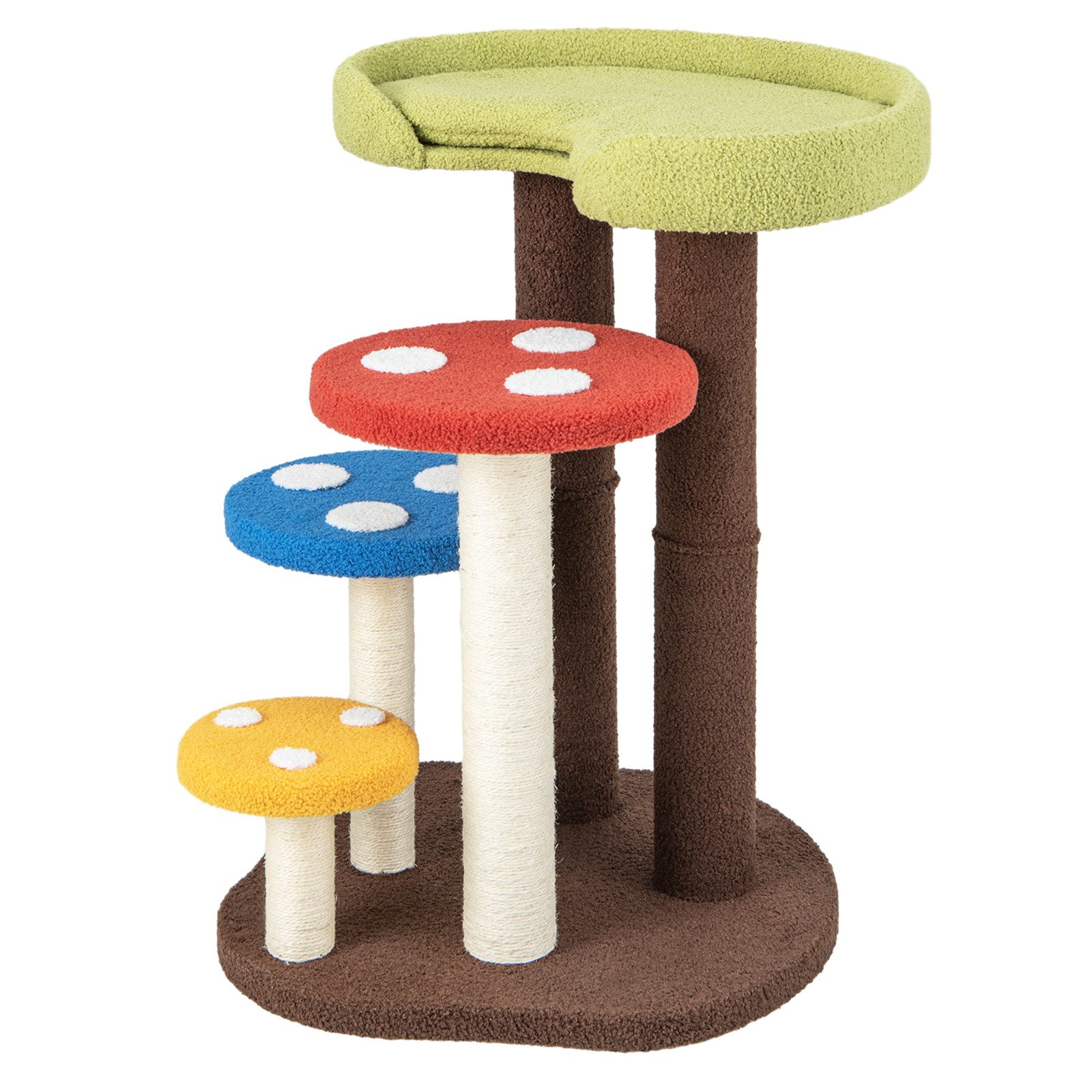 Dieser aus natürlichem und dichtem Sisal gefertigte Kratzbaum schützt Ihre Möbel vor lästigen Kratzspuren und erspart Ihnen so viel Ärger. Er befriedigt die Instinkte Ihrer Katze und verfügt über drei vollständig umwickelte Sisalstämme. Mit 5 Ebenen bietet der Katzenturm unterschiedliche Plattformhöhen und lädt Ihre Katze zum Klettern, Springen, Erkunden und Sitzen ein. Der Kratzbaum ist mit hochwertigem Teddystoff umhüllt und bietet Ihren pelzigen Freunden einen gemütlichen Rückzugsort zum Entspannen. Ausgestattet mit einer abnehmbaren Matte, die hand- und maschinenwaschbar ist, war die Reinigung noch nie so einfach. Als stabiler und sicherer Katzenpark ist der Kratzbaum mit 4 cm dicken Brettern und einer vergrößerten stabilen Basis befestigt. Darüber hinaus ist es durch sein faszinierendes Pilzdesign eine praktische und auffällige Ergänzung, die Ihrem Wohnzimmer, Eingangsbereich oder Schlafzimmer eine entzückende Note verleiht. Verwöhnen Sie Ihren geliebten Katzengefährten mit einem ganz persönlichen Rückzugsort.