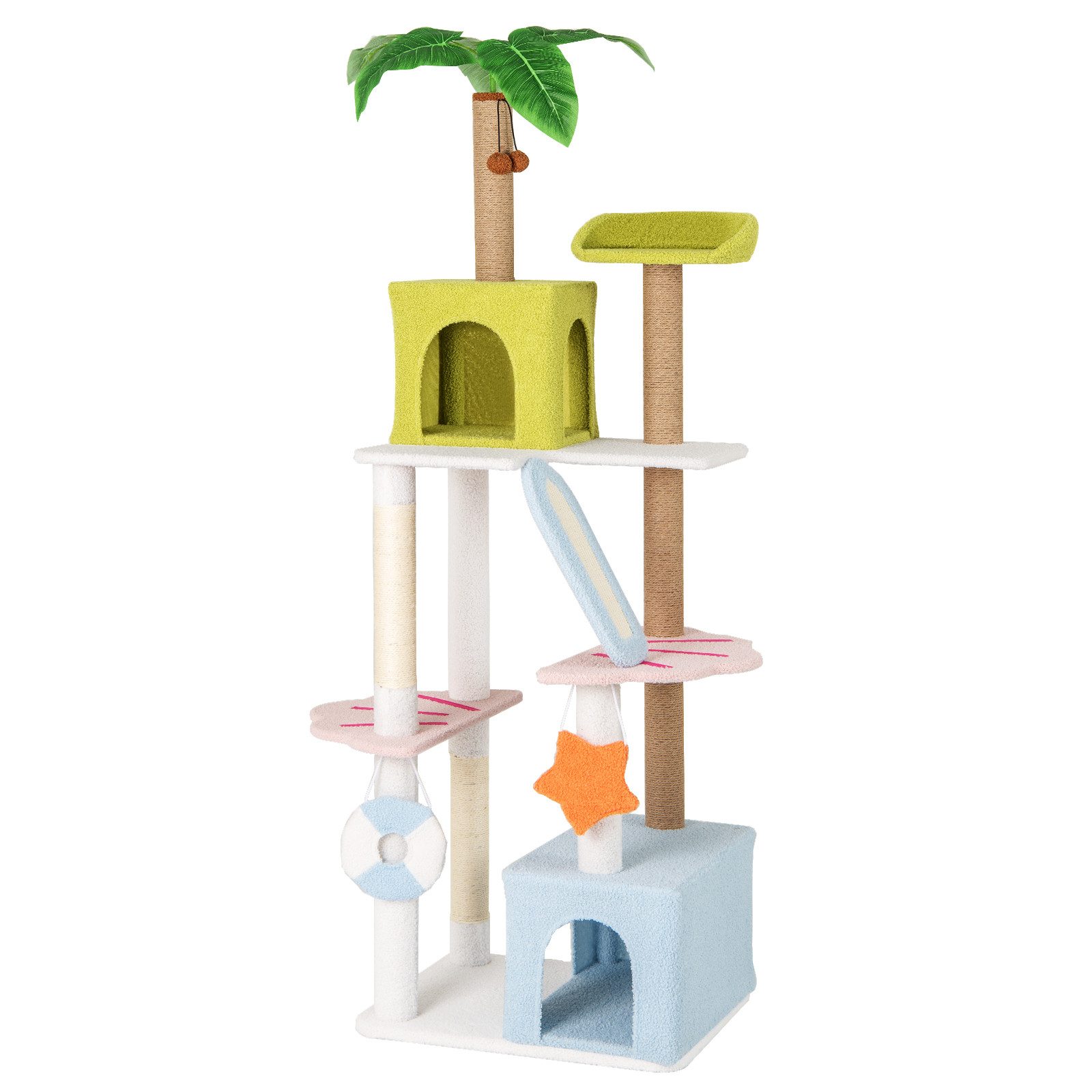 Unser 180 cm hoher Katzenbaum besticht durch seine erfrischende Farbpalette, die mit bezaubernden, vom Strand inspirierten Ornamenten geschmückt und mit künstlichen grünen Blättern für einen Hauch von Küstenstimmung gekrönt ist. Er stimuliert Ihre Katze nicht nur geistig und körperlich, sondern wertet auch Ihre Heimdekoration mit seiner ausgeprägten und verspielten Strandatmosphäre auf. Es gibt 2 große Katzenhöhlen und eine obere Sitzfläche, die verschiedene Ruhezonen bieten, die jeweils mit weichem Teddyplüschstoff bedeckt sind, der zu stundenlanger Entspannung einlädt. Der Katzenkletterständer wird auch mit Sisalpfosten, Jutepfosten und einem Kratzbrett geliefert, an dem sie ungestört ihre Krallen wetzen können. Darüber hinaus enthält er interaktives Spielzeug – Plüschbälle und Geräuschspielzeug, die die Neugier wecken und Ihre Katze in lebhaftes und temperamentvolles Spiel verwickeln sollen. Für zusätzliche Sicherheit ist unser Katzenturm mit einem Kippschutz ausgestattet, der sicherstellt, dass die Struktur aufrecht bleibt, egal wie aktiv Ihre Katze ist.