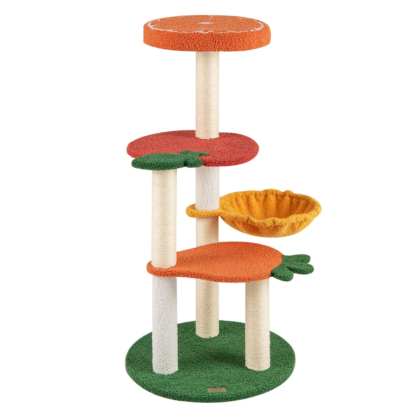 Mit einem charmanten Obstthema entworfen, bietet er eine karottenförmige untere Plattform, eine apfelförmige mittlere Plattform und einen orangenen oberen Liegeplatz. Die 48,5 cm breite runde Basis sorgt für eine solide Grundlage, die das Umkippen des Katzenbaums verhindert, selbst wenn Ihre Katze klettert oder springt. Darüber hinaus verfügt dieses Katzenaktivitätszentrum über ein weiches Schwammpolster auf dem orangen oberen Liegeplatz, das Ihrer Katze einen komfortablen Bereich zum Liegen bietet. Die Kratzsäulen sind so konzipiert, dass sie den natürlichen Kratzinstinkten Ihrer Katze gerecht werden und gleichzeitig Ihre Möbel schützen.