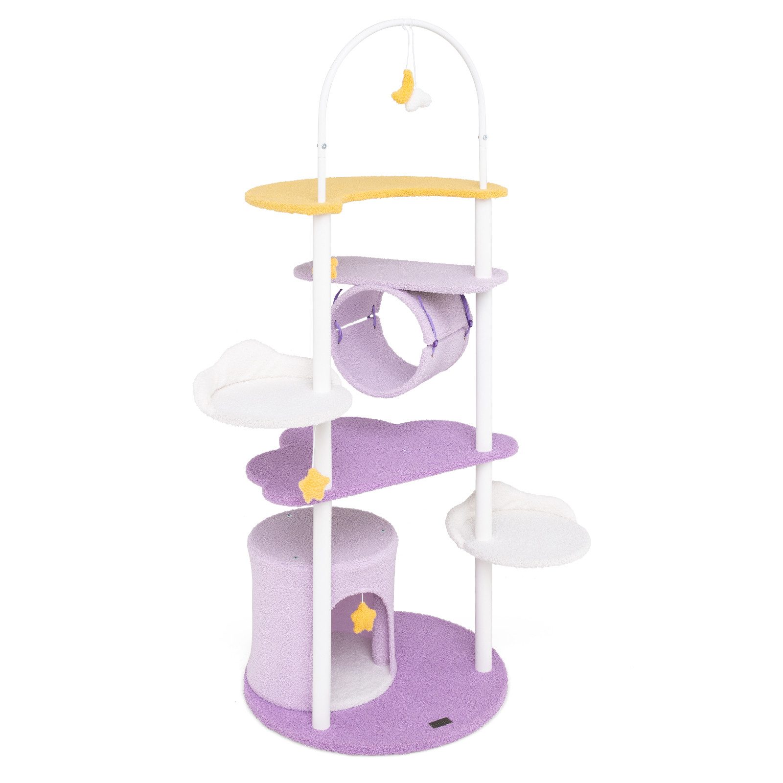 Der süße Katzenturm zieht mit seinem ansprechenden Erscheinungsbild sofort alle Blicke auf sich. Die große mondförmige Aussichtsplattform mit 2 Spielbällen ermöglicht es Katzen, ihr Reich zu überblicken oder in den Himmel zu schauen. Die große Höhle bietet einen gemütlichen Rückzugsort zum Ausruhen. Zudem verfügen 2 weiße Sitzstangen über wolkenförmige Ränder, die ein Abrutschen verhindern. Er ist mit einem Kippschutz, einer großen Basis und stabilen Metallpfosten ausgestattet, die für die nötige Stabilität sorgen. Das Katzenspielhaus für den Innenbereich ist mit Teddystoff bezogen, was eine weiche, allergenfreie Umgebung für Ihre Haustiere garantiert.
