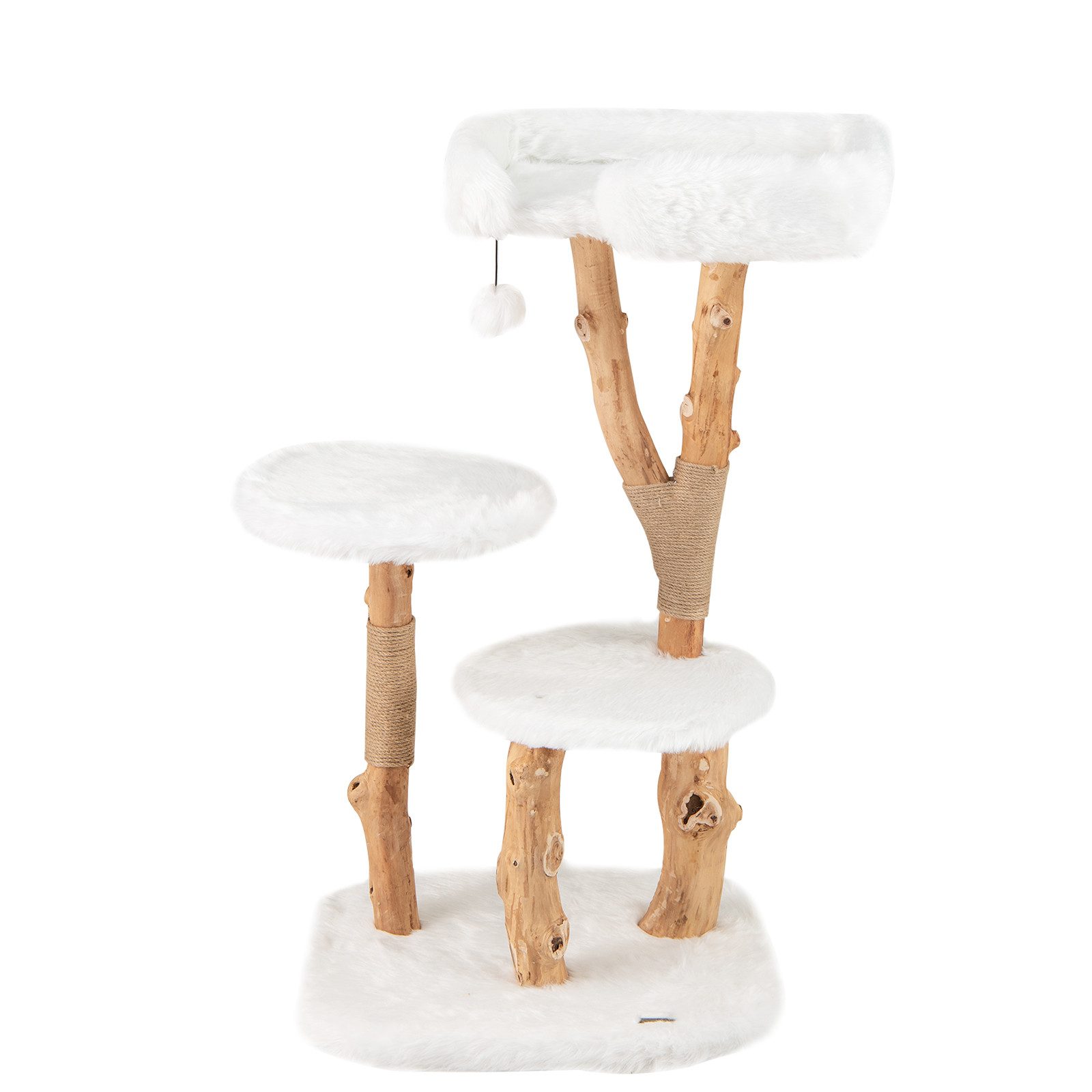 Dieser exquisit gefertigte Kratzbaum besteht aus natürlichen Birnbaumholzstämmen mit einzigartigen Maserungen, die nicht nur die Ästhetik verbessern, sondern auch eine stabile und sichere Struktur gewährleisten, auf der Ihre Katze sich ausruhen und spielen kann. Es gibt eine gemütliche Oberfläche zum Beobachten der Umgebung, 2 runde Plattformen zum Entspannen und Springen, Jutepfosten zum Krallenwetzen und einen baumelnden Plüschball für interaktiven Spaß, der mehrere Ebenen des Vergnügens bietet. Außerdem ist jede Plattform mit 800 g/m² hochwertigem Langplüschstoff bedeckt, der unvergleichliche Weichheit und Komfort für das Wohlbefinden Ihrer Katze bietet. Schenken Sie Ihrem geliebten Haustier mit diesem Kratzbaum aus Massivholz ein natürliches und unterhaltsames Refugium!