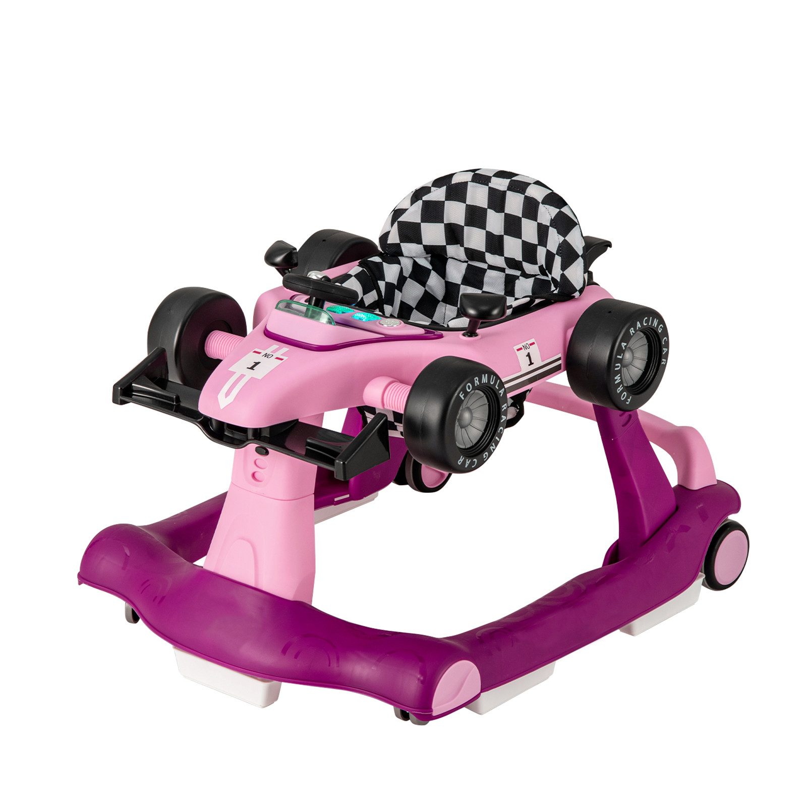 Höhe und Geschwindigkeit sind je nach individuellen Bedürfnissen der Kleinen einstellbar. Außerdem steht die Sicherheit bei uns an erster Stelle, daher gibt es eine Kopfstütze sowie rutschfeste Stufen und Räder. Der Sitz ist mit weichem Schaumstoff gepolstertund hat eine ergonomische Rückenlehne, wodurch der Sitzkomfort garantiert ist. Die Musik und die Lichter machen den Kindern zusätzlich Spaß. Nach Gebrauch können Sie die Lauflernhilfe einfach zusammenklappen.