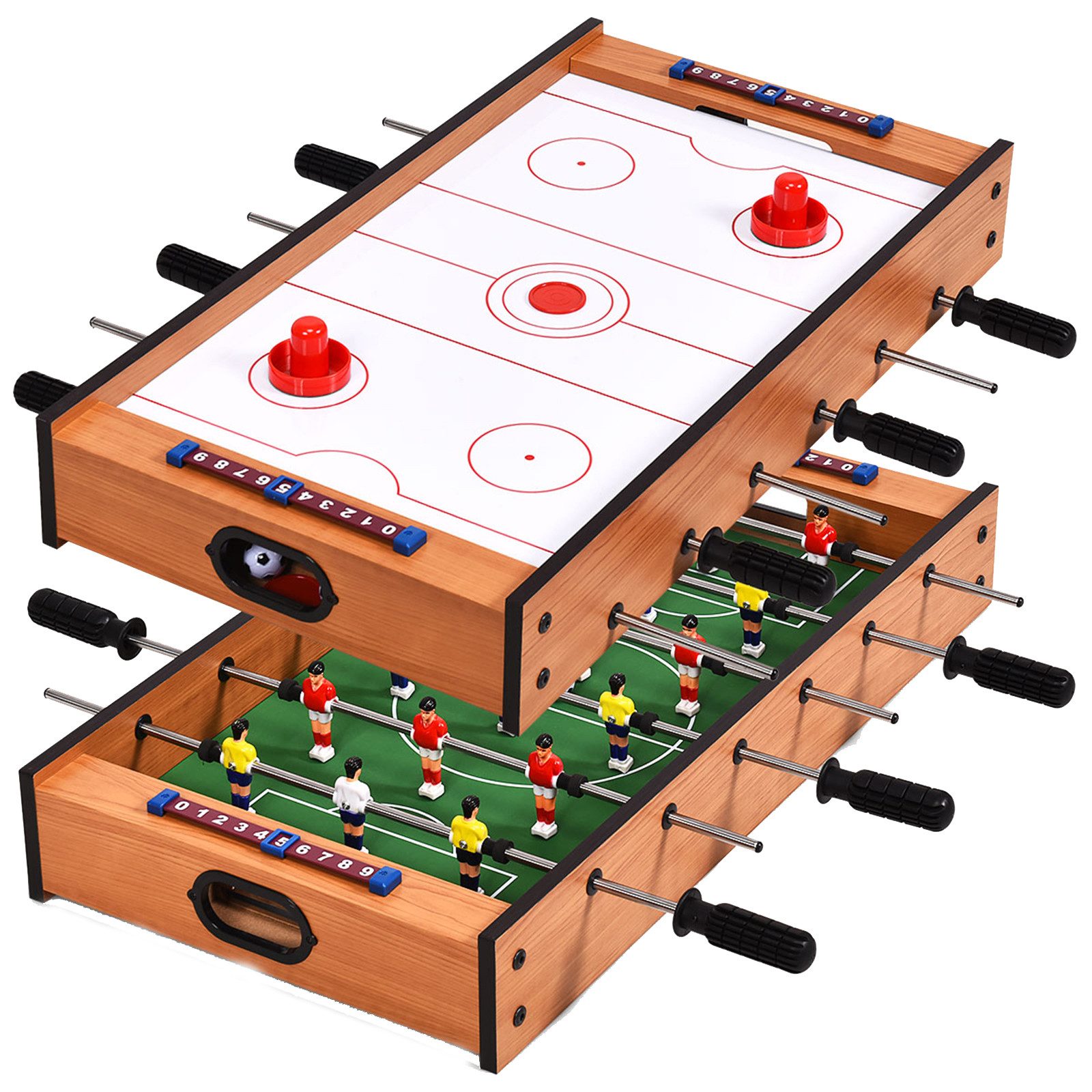 Unser 2-in-1 Spieltisch kombiniert einen klassischen Tischkicker mit einem Air-Hockey-Set und sorgt so für jede Menge Spaß für die ganze Familie. Dabei eignet er sich ebenso wunderbar sowohl für jedes Wohn- und Spielzimmer als auch für Bars, Einkaufszentren und Partyabende. Er ist dabei aus hochwertigem Material gefertigt, welches ebenso sehr umweltfreundlich ist und eine lange Nutzungsdauer gewährt. Der stabile Rahmen sorgt für einen hervorragenden Halt und schützt den Tisch vor Umkippen und Verrutschen. Das einzigartige Klappdesign ermöglicht hierbei einen sehr leichten Wechsel des Spielfeldes.