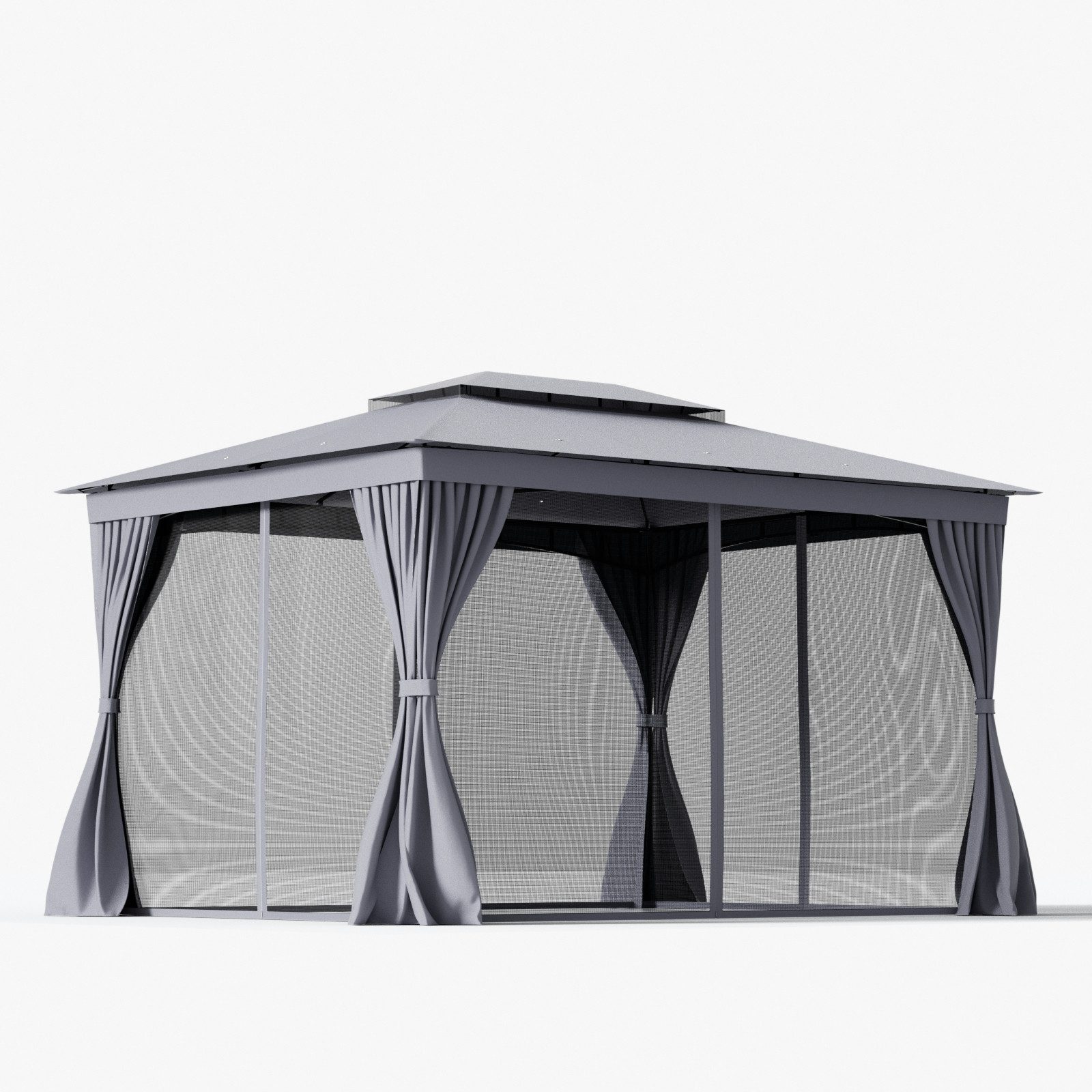 Unser 397 x 296 cm großer Gartenpavillon bietet eine Grundfläche von 12 m² und ist ideal, um mit Ihrer Familie und Freunden im Freien zu vergnügen. Dank der integrierten doppellagigen Seitenwände, komplett mit Maschennetz und Vorhängen mit Reißverschluss, können Sie eine intime Atmosphäre ohne „unerwartete Gäste“ und neugierige Blicke genießen oder an wärmeren Tagen die Brise durchlassen. Darüber hinaus verfügt er über ein zuverlässiges PU-beschichtetes Polyesterdach und einen robusten Metallrahmen, der verschiedenen Wetterbedingungen standhält und eine langfristige Nutzung im Freien gewährleistet. Und es gibt ein doppelstöckiges Dach und mit Pfählen befestigte Platten, die den Pavillon stabiler machen. Dank der Flügelschraubenverbindungen sind keine Werkzeuge erforderlich, die Installation des Terrassenüberdachs ist einfacher als je zuvor. Nutzen Sie ihn, um unvergessliche Erinnerungen mit Familie und Freunden zu schaffen.