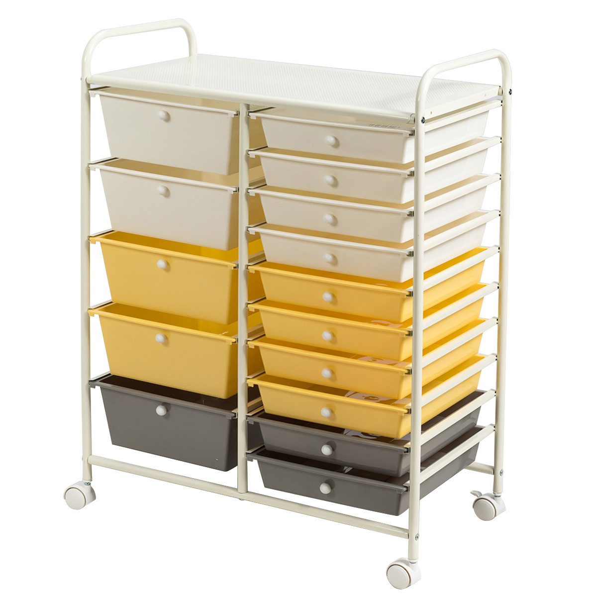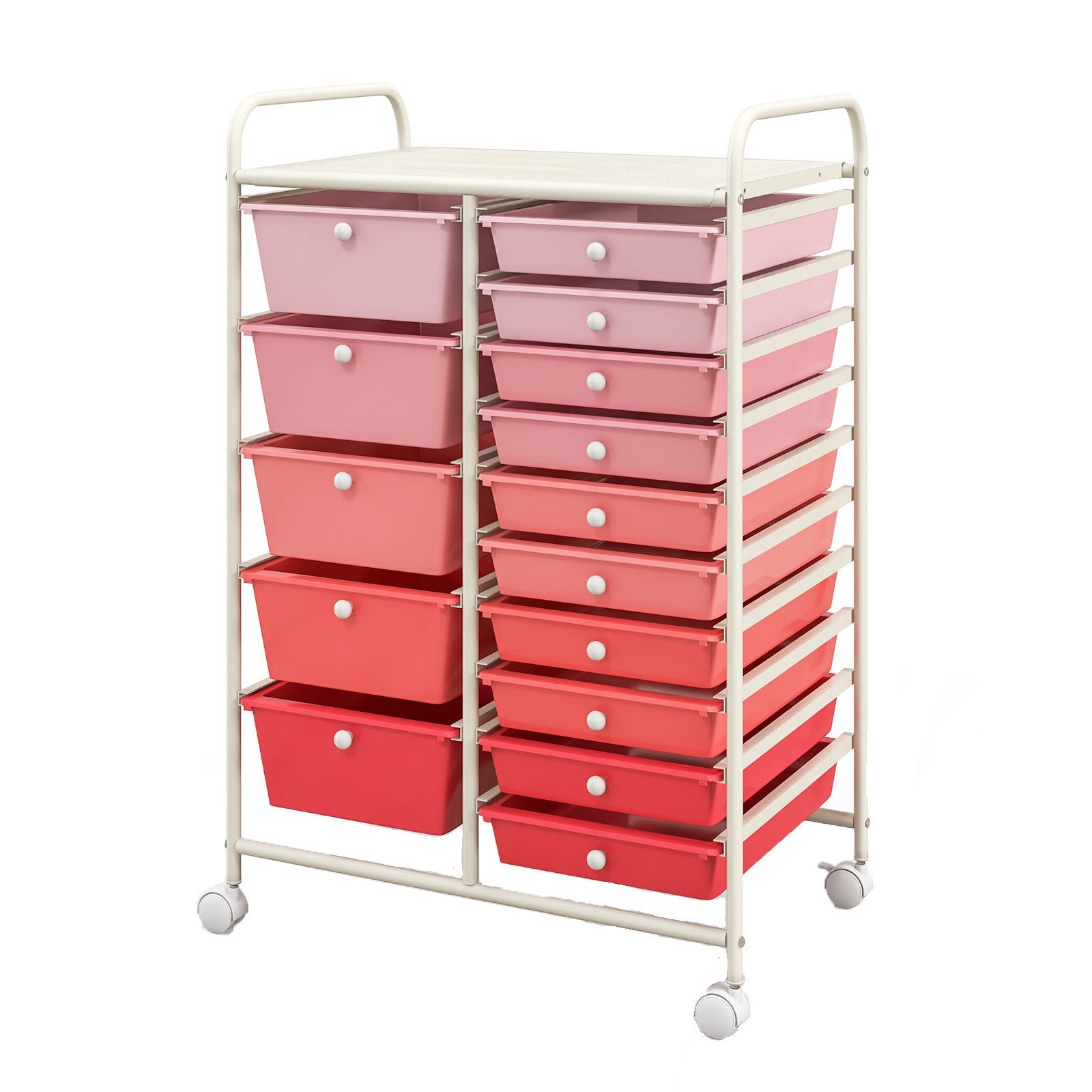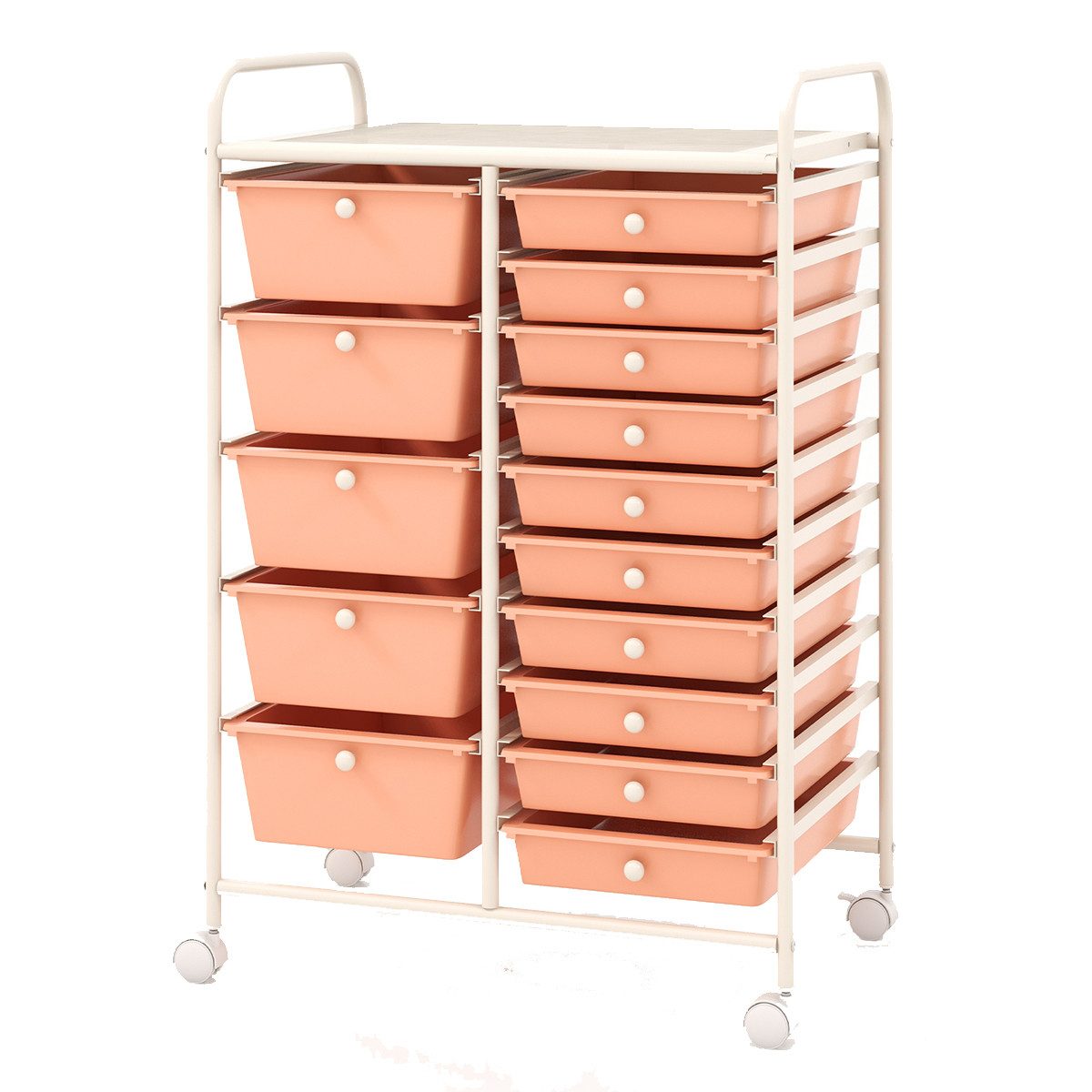 Der Bad-Rollwagen ist vielseitig einsetzbar. Im Bad für Kosmetikartikel und Handtücher, beim Friseur für Lockenwickler, Haarspangen und -bürsten usw. oder aber auch im Büro für Schreibutensilien, Büroklammern, Briefumschläge und vielem mehr. Mit seinen 15 Schubladen aus Kunststoff und einer Ablagefläche, bietet der Rollcontainer ausreichend Platz um Ihre Utensilien zu verstauen. Durch die 4 Rollen ist der Rollwagen sehr beweglich und kann in jede Ecke gestellt werden.
