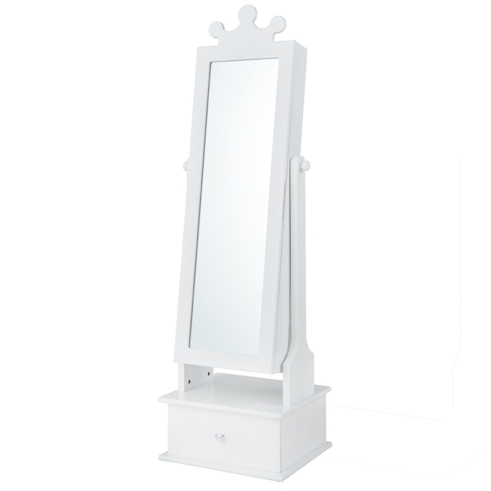 Dieser niedliche Schmuckschrank mit Spiegel ist ideal für Kleinkinder ab 3 Jahren zum Anziehen. Die obere Krone gefällt den meisten Kindern. Der Ganzkörperspiegel mit 2 verstellbaren Winkeln sorgt für einen Blick von Kopf bis Fuß, sodass Kinder ihr Outfit auf einen Blick sehen können. Mittlerweile verfügt er über 18 Ohrringschlitze und -löcher, 7 Halskettenhaken, 6 Armbandhaken, 4 Ablagefächer und 2 kleine Schubladen hinter der Spiegeltür. Kinder können ihre Socken oder Schals auch in der unteren Schublade unterbringen. Um seine Stabilität und Sicherheit zu gewährleisten, haben wir ihn mit einem Kippschutzsystem und rutschfesten Fußpolstern ausgestattet.