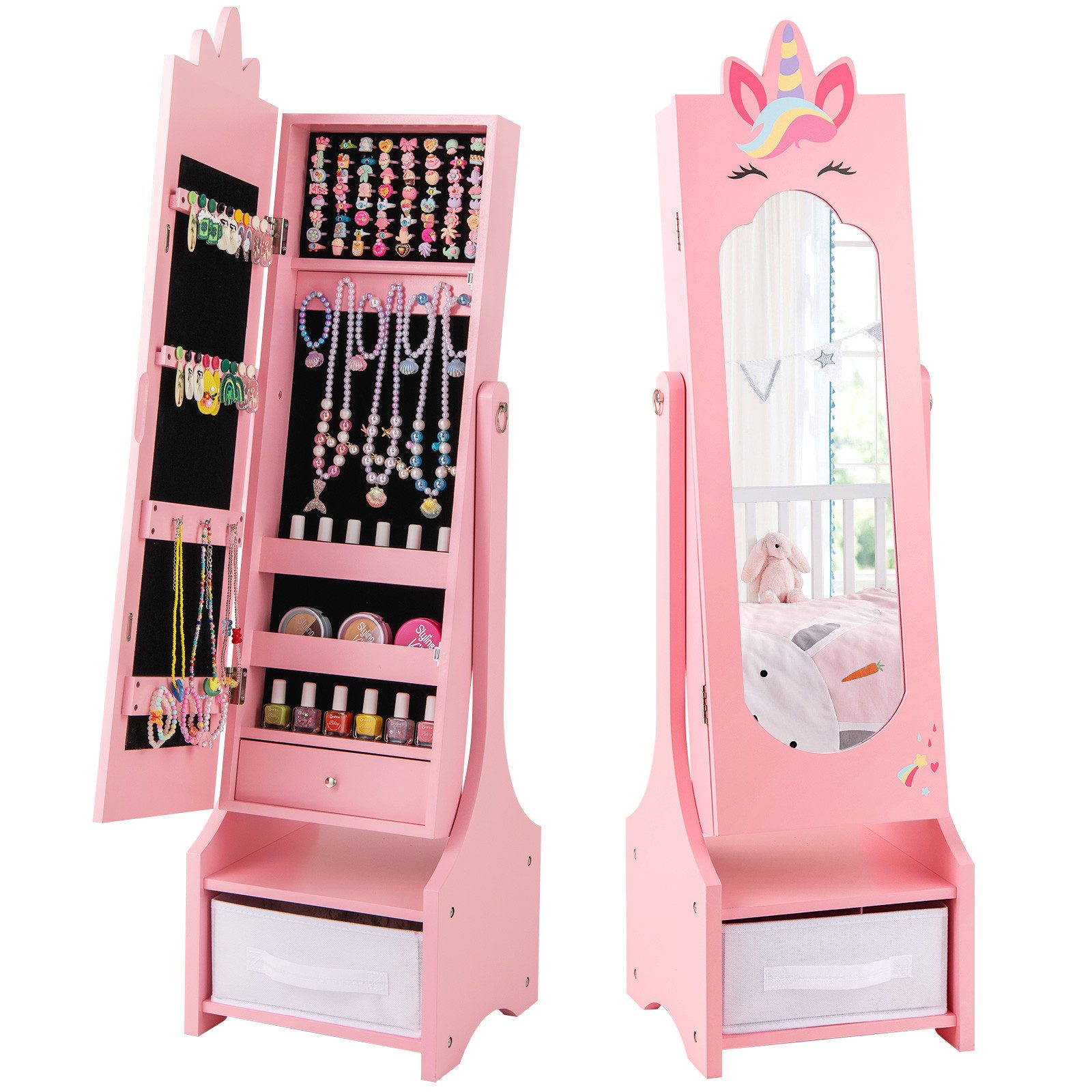 Dieser Schmuckschrank verfügt über einen HD-Silberspiegel für einen optimalen Betrachtungswinkel von Kopf bis Fuß und sorgt dafür, dass Ihre Kinder immer stilvoll aussehen. Der Schmuckständer bietet reichlich Stauraum mit verschiedenen Fächern für Ohrringe, Armbänder, Ringe und mehr. Diese platzsparende 2-in-1-Lösung kombiniert einen Spiegel und eine Menge Stauraum für Schmuck und ist somit perfekt für kleine Räume. Er ist robust und sicher gebaut und entspricht hohen Standards. Für zusätzliche Sicherheit kann er auf Wunsch an der Wand befestigt werden.