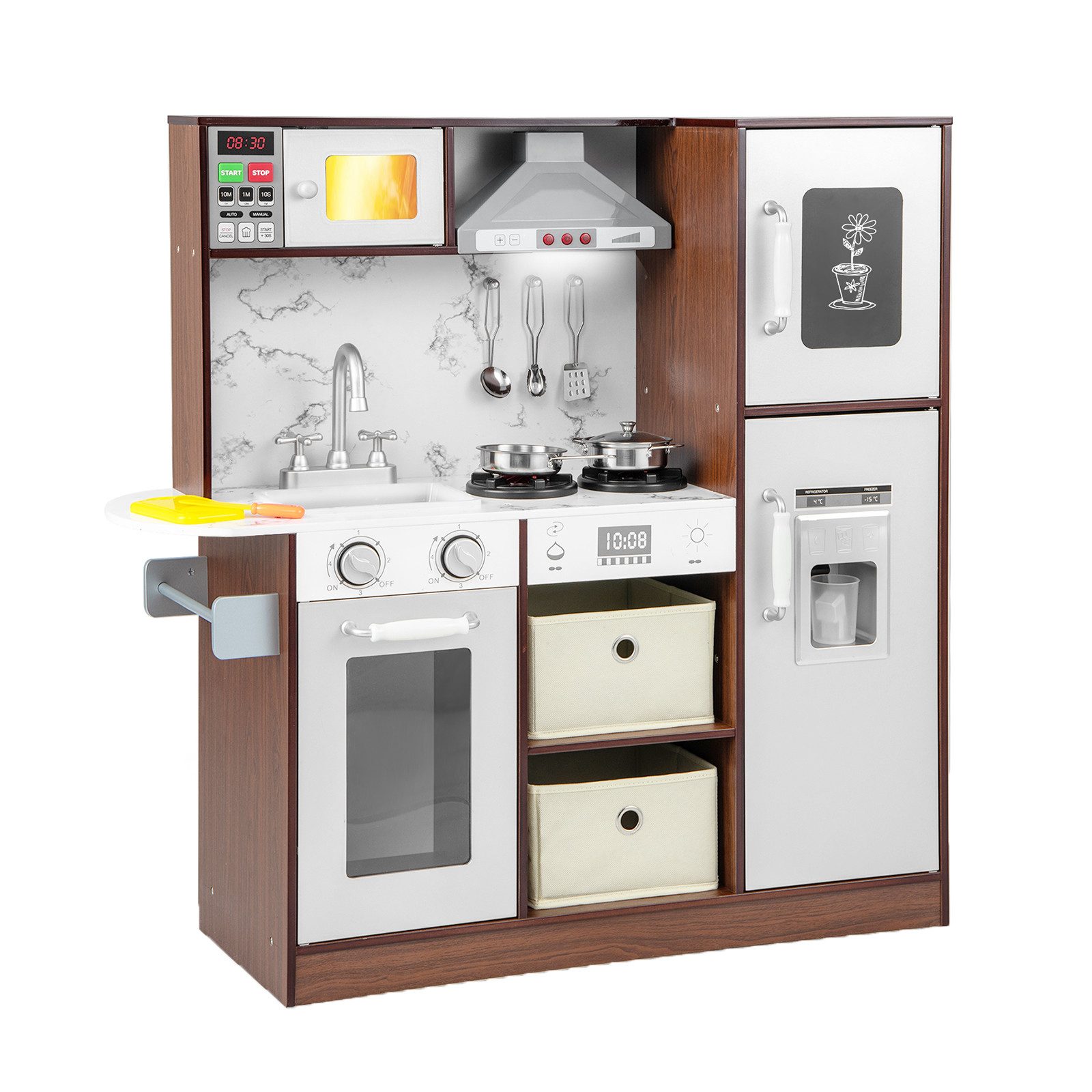 Diese Kinderküche verfügt über verschiedene Licht- und Soundeffekte für die Mikrowelle, die Dunstabzugshaube und die Herde, wodurch der Kochvorgang realistischer wird. Außerdem ertönen Klickgeräusche, wenn Kinder die Knöpfe drehen oder Eiswürfel nehmen, was die Spielzeit noch spannender macht. Der Vorbereitungsbereich, der Wasserhahn, die Spüle und der Bräter helfen Ihrem Kleinen dabei, Essen zu schneiden, Obst zu waschen und zu backen. Всеs in Всеm ist unsere Spielzeugküche dank der hochwertigen Materialien und gratfreien Kanten langlebig und sicher genug für Kinder ab 3 Jahren.