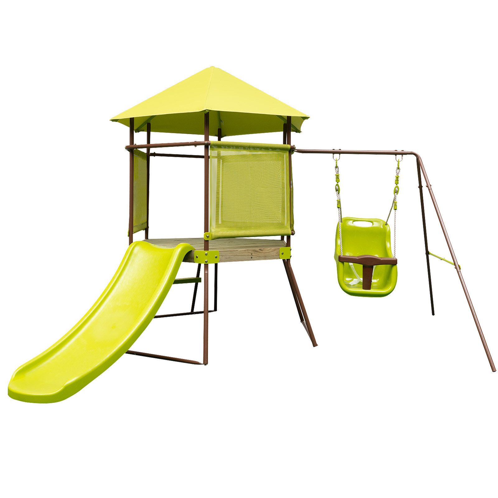 Der Hinterhofspielplatz umfasst ein Spielhausfort, einen Babysitz, eine Rutsche und eine Leiter und sorgt so für stundenlangen Spaß im Hinterhof. Der höhenverstellbare Babysitz, geeignet für Kinder im Alter von 6 bis 24 Monaten, verfügt über solide Karabinerhaken, mehrsträngige Seile und einen Sicherheitsgurt für zusätzlichen Schutz. Der stabile Metallrahmen und die Erdnägel tragen zur Stabilität dieses Spielsets bei. Das überdachte Fort ist mit Sicherheitsnetzen für mehr Sicherheit ausgelegt. Darüber hinaus ist dieses Metallschaukelset perfekt für Ihren Hinterhof, um Kinder zu aktivem Spielen einzuladen und stundenlangen Spaß zu bieten.