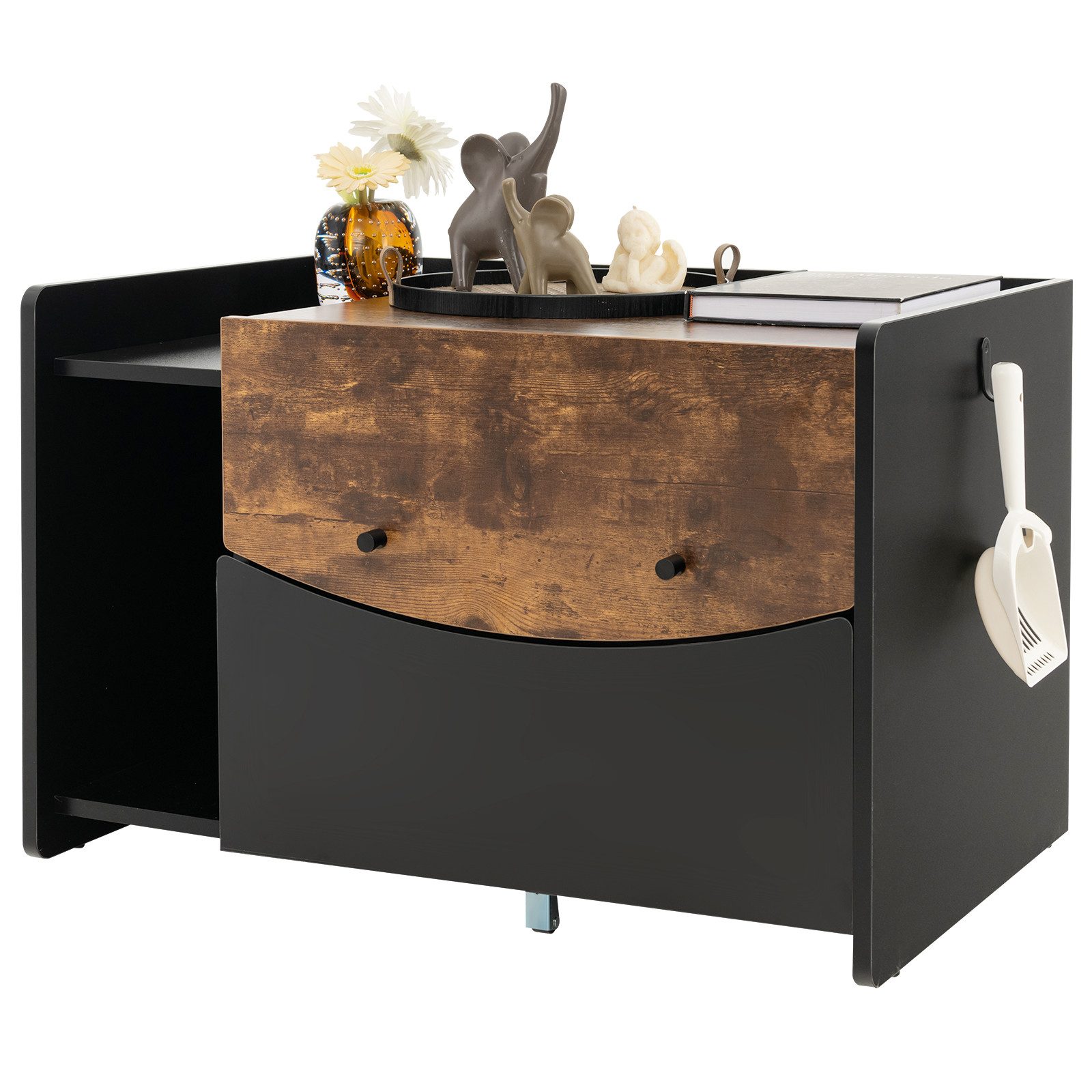 Unser Katzenmöbel-Schrank zeichnet sich durch ein retro und elegantes Erscheinungsbild aus, das nicht nur ein praktischer Katzen-Waschraum ist, um Katzenklos zu verstecken, sondern auch eine perfekte Ergänzung zu Ihrer Wohnkultur sein kann. Mit einem praktischen Design mit herausziehbarer Schublade gewährleistet diese Verkleidung eine einfache Reinigung und Wartung. Die Schublade ist mit reibungslos gleitenden Schienen und einem rollbaren Rollenständer für mühelose Bewegung ausgestattet. Darüber hinaus legt unsere Verkleidung Wert auf die Privatsphäre Ihrer Katze und bietet einen gewundenen Eingang mit einer glatten und abgedichteten Kantenkonstruktion, um zu verhindern, dass Katzenhaare haften bleiben. Mit seiner geräumigen Tischplatte und einem seitlichen Haken bietet dieses Katzenklo-Versteck die perfekte Kombination aus Stil und Praktikabilität für Sie und Ihre Samtpfote. Es misst 78 x 50 x 51,5 cm (L x B x H) und der Innenraum misst 49,5 x 43,5 x 37 cm (L x B x H), daher messen Sie bitte die Размер des Katzenklos vor dem Kauf.