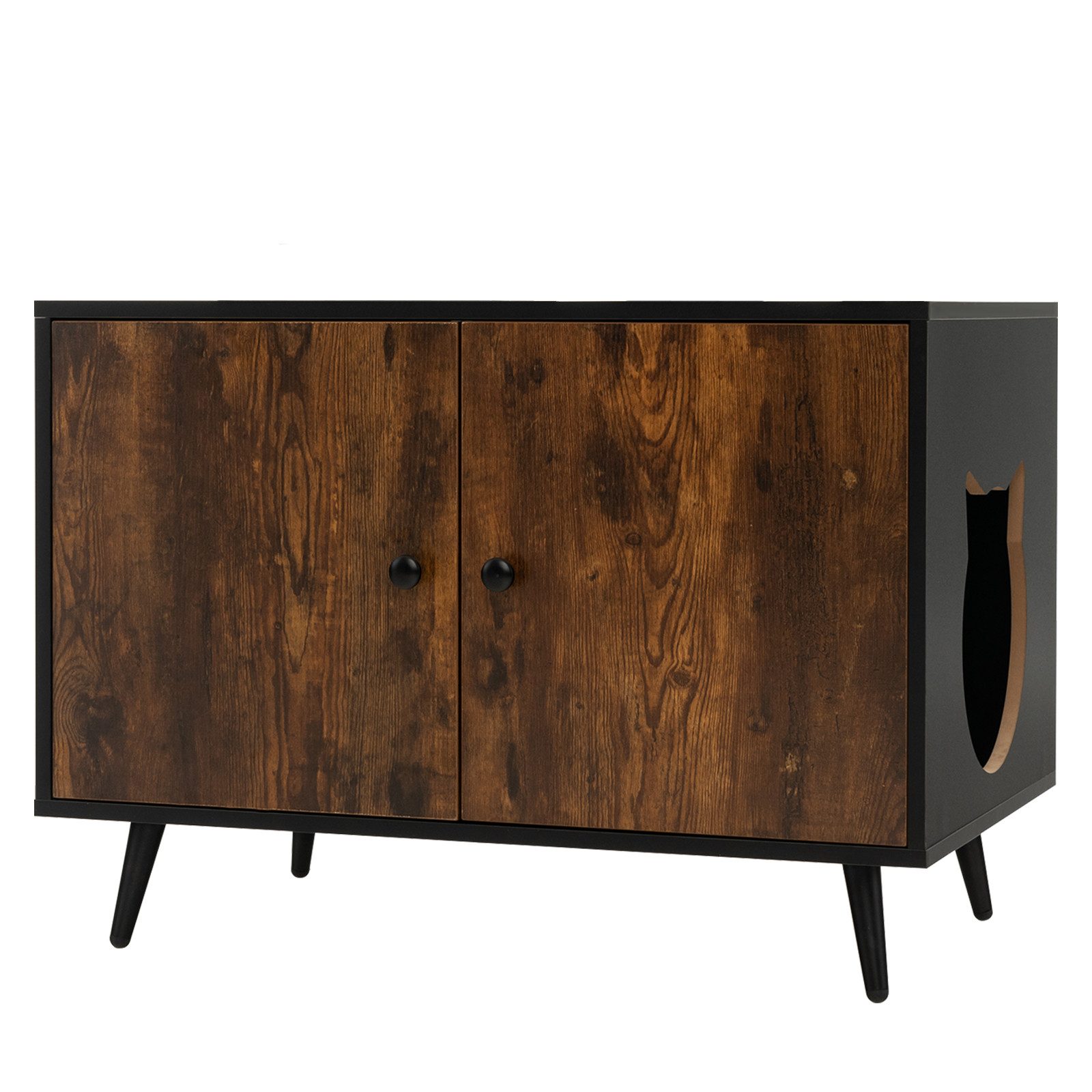 Unser vielseitiger Katzenschrank mit viel Platz wird Ihr Zimmer sauberer und schöner machen. Mit ihr kann das Katzenklo versteckt werden und Ihre Katze kann ungestört ihre Zeit dort verbringen. Außerdem ermöglicht der Trenner im Schrank, dass Sie eine Seite zur Aufbewahrung von Katzenzubehör verwenden können. Die geräumige Tischplatte bietet Platz für viele Gegenstände. Daher ist dieser multifunktionale Katzenhaus auch als Beistelltisch geeignet. Der Schrank ist mit einem Eingang innen und außen konzipiert, damit die Katzen problemlos hinein- und herausgehen können, ohne Katzenstreu auf den Boden zu bringen.