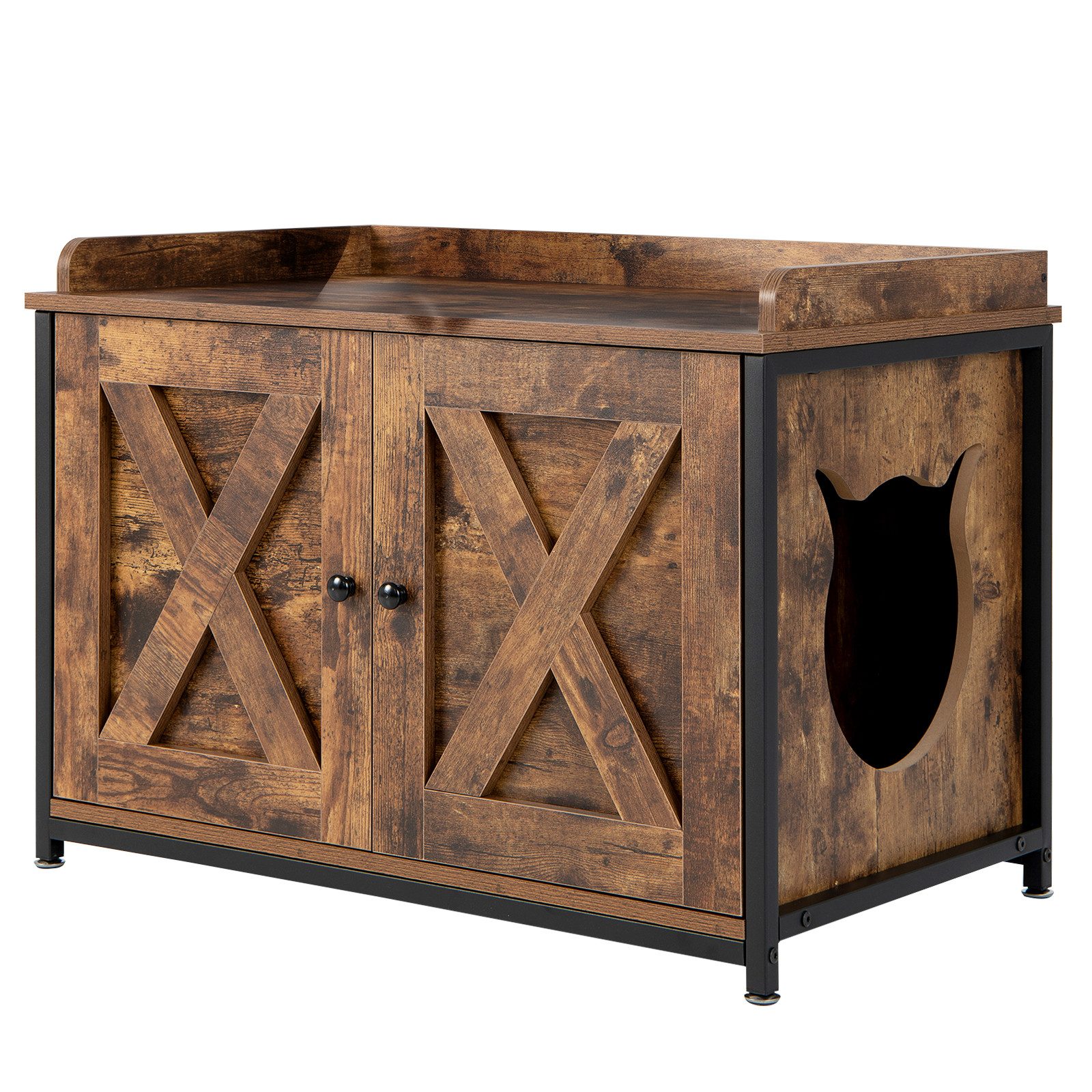 Holen Sie sich ein privates und komfortables Haus für Ihr schönes Kätzchen! Unser industrieller Katzenmöbelschrank verfügt über exquisite Holzmaserungen und einen mattschwarzen Metallrahmen, der nicht nur ein praktischer Katzenschrank zum Verstecken von Katzentoiletten sein kann, sondern auch eine perfekte Ergänzung zu Ihrer Wohnkultur sein wird. Das Katzenklo-Gehäuse ist perfekt für Kätzchen, um ihre Geschäfte zu verrichten und ihnen ein Gefühl von Sicherheit und Ruhe in der geschlossenen Umgebung zu geben. Darüber hinaus können Sie es auch neben das Sofa oder Bett oder in den Flur stellen, um Gegenstände aufzubewahren und Ornamente auszustellen.