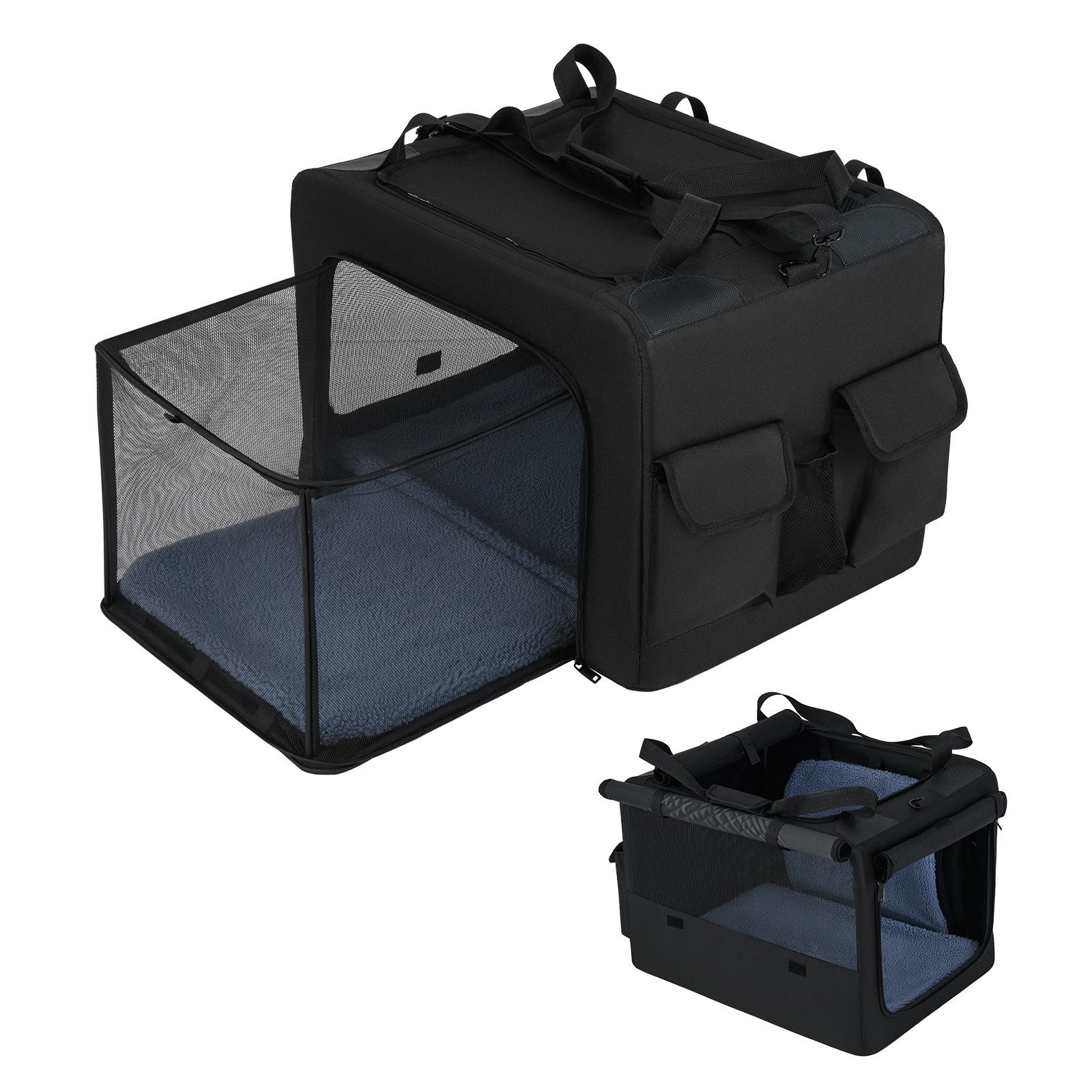 Diese vielseitige Transportbox für Haustiere vereint Funktionalität und Komfort. Sie verfügt über mehrere Öffnungen und Netzfenster für bessere Sicht und einfachen Zugang zu Ihrem Haustier. Sie enthält einen ausziehbaren Netzkorb, damit Ihr Haustier sicher und bequem untergebracht ist. Das faltbare und tragbare Design ermöglicht eine kompakte Aufbewahrung und macht sie ideal für Reisen, Camping oder den täglichen Gebrauch. Dank der abnehmbaren Schultergurte kann sie problemlos als Handtasche oder Rucksack getragen werden. Diese Transportbox ist für Aktivitäten im Innen- und Außenbereich geeignet. Sie ist aus Oxford-Stoff gefertigt und wird von einem stabilen Metallrahmen getragen, der eine lange Haltbarkeit gewährleistet. Впередhin enthält sie ein weiches Kissen für zusätzlichen Komfort sowie praktische Seitentaschen zur Aufbewahrung wichtiger Dinge und einen Getränkehalter.